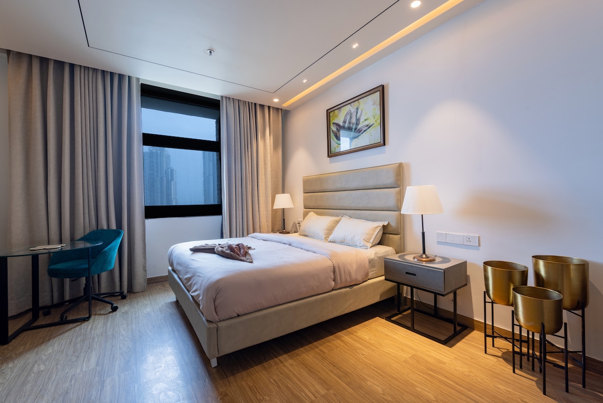 Aurae by Lumen Leaf to designerski luksusowy apartament typu studio, który wznosi się wysoko nad AIPL Joy Street w Gurgaon. Okno od podłogi do sufitu z widokiem na miasto. Ciesz się niezrównanym komfortem: designerskie łóżko, miękkie narzuty, nastrojowe oświetlenie, szybkie Wi-Fi, Netflix, konsola do gier retro, głośnik Marshall, wydzielone miejsce do pracy, aneks kuchenny, minibar i oświetlony słońcem kącik do czytania. INOX, kawiarnie i sklepy znajdują się na dole, a CyberHub, Golf Course Road i HUDA City Metro są oddalone o 12 minut – idealne na podróże służbowe, wypoczynek lub wypady dla par.