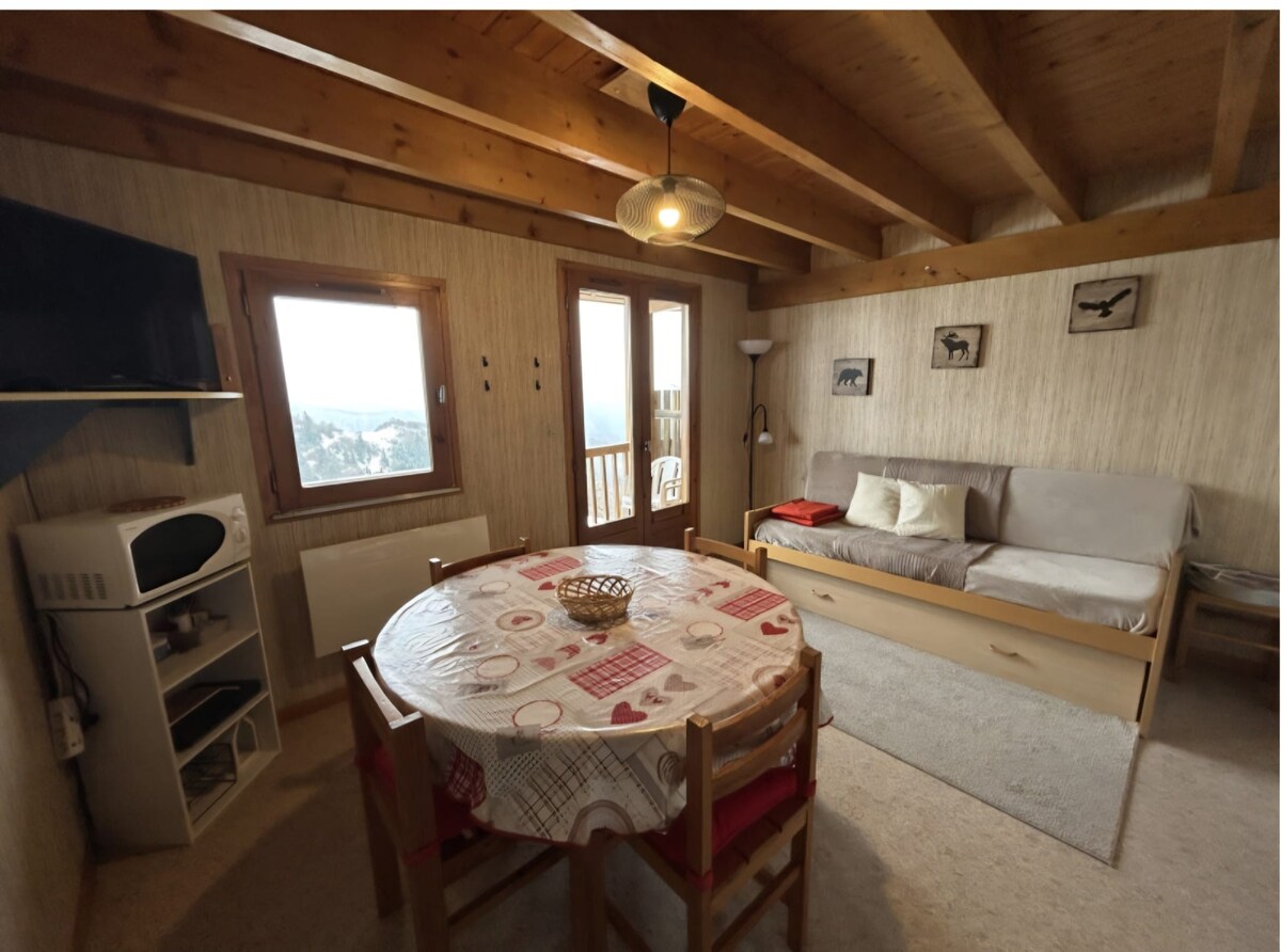 Studio dla maksymalnie 4 osób Udogodnienia: podwójne łóżko składane w 160 i składane łóżko piętrowe (pościel nie jest wliczona w cenę) Kuchnia: wyposażony aneks kuchenny (płyta grzewcza, lodówka, ekspres do raclette, ekspres do kawy Dolce Gusto, toster...) Łazienka: z prysznicem Meble: stół dla 4 osób chowany Komfort: nowa stolarka z elektryczną roletą Balkon: stolik boczny Bezpieczny schowek na narty na parterze rezydencji Bezpośrednie sąsiedztwo stoków i ESF