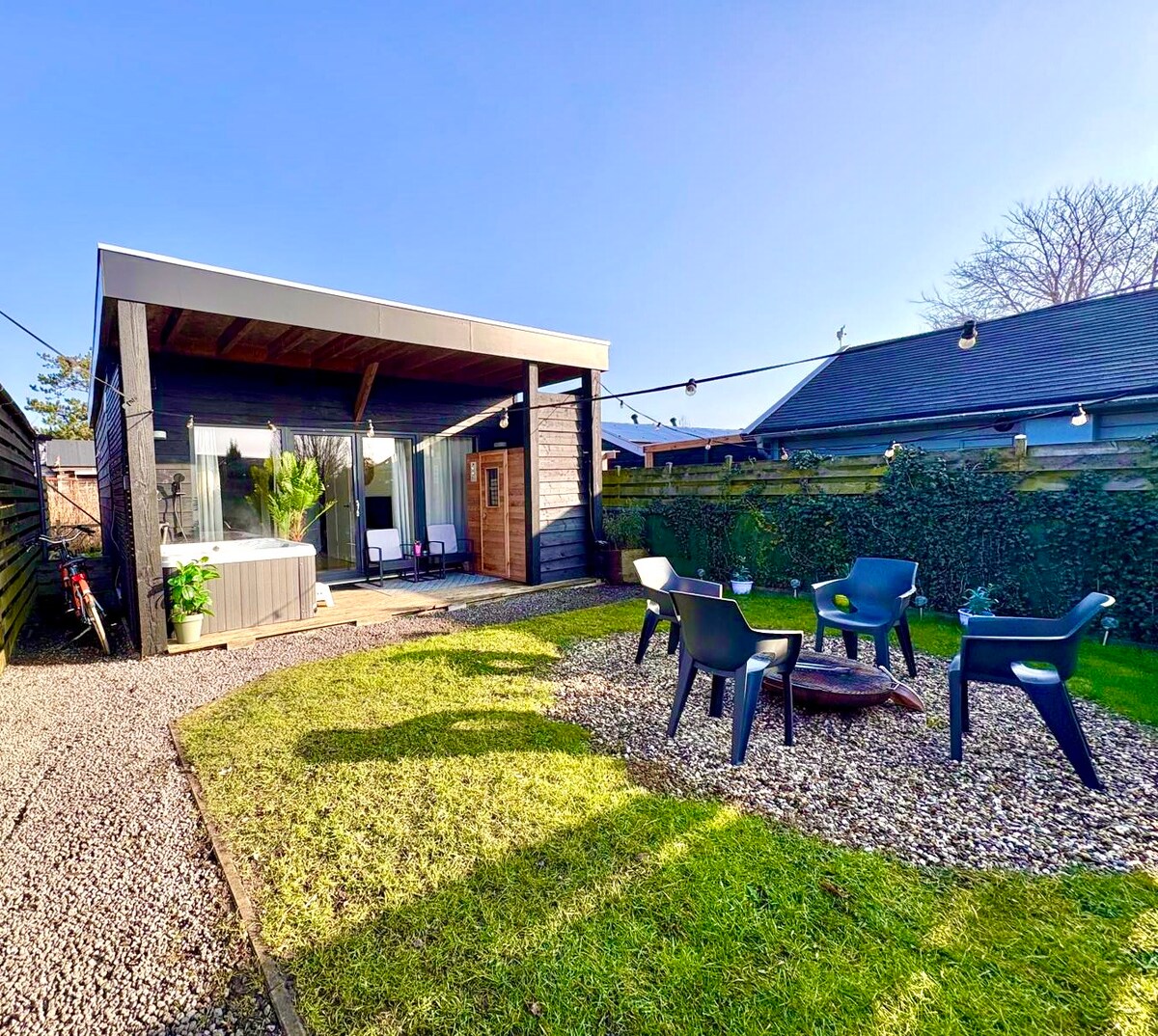 Czarujący skandynawski ekologiczny dom, ogród i jacuzzi