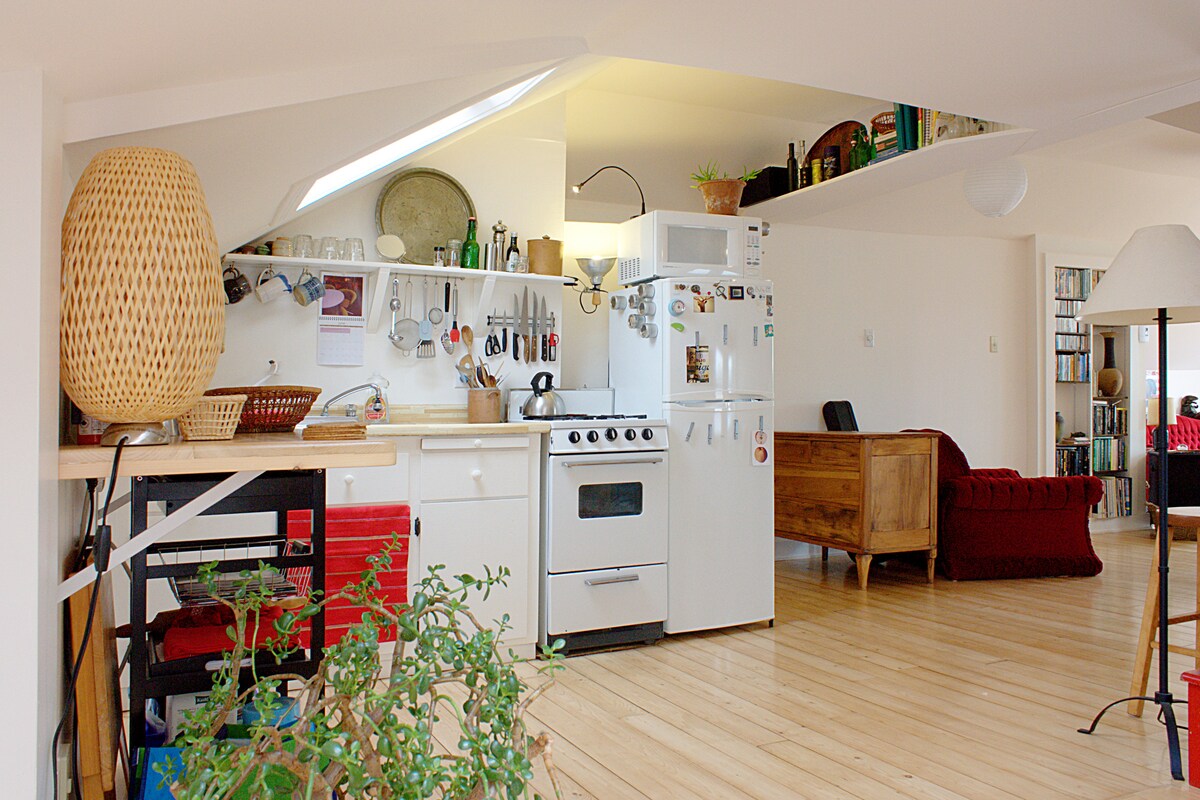 Mały dom/studio artystyczne to coś innego niż zwykłe z obfitym światłem i oryginalną sztuką. Odsłonięte drewno jest odrestaurowane z oryginalnego budynku z lat 40. Łazienka w europejskim stylu gospodarczym. Stroma drabina zabierze Cię do przytulnego loftu z wygodnym łóżkiem typu queen-size i zakamarkami do siedzenia i czytania/medytacji. Min spacerem do Chocolate Lake. Blisko Long Lake, parków nad oceanem i wędrówek. Przystanek autobusowy i 24-godzinny sklep po drugiej stronie ulicy. 10 minut jazdy samochodem od centrum miasta. Zrelaksuj się w hamaku do jogi Arial.