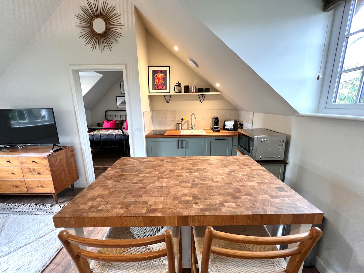 Małe, ale doskonale uformowane mieszkanie z jedną sypialnią w wiejskiej okolicy. W aneksie znajduje się mała kuchnia z płytą grzewczą, kuchenką i mikrofalówką. Jest stół do jedzenia. Jedno podwójne łóżko i łazienka z prysznicem. Mamy dobry internet szerokopasmowy, a na terenie obiektu znajduje się parking. W wiosce znajduje się świetny pub w odległości spaceru i mnóstwo pięknych spacerów. Jesteśmy około 11 mil od Winchester i 3 mile od Chawton Jane Austen. Nasze schody do mieszkania są strome i wąskie.