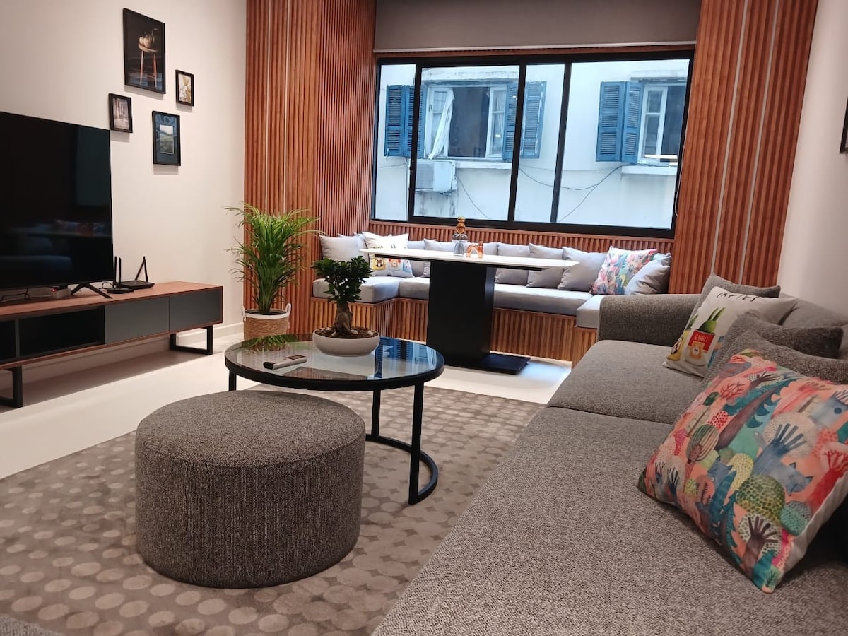 Wejdź do neoklasycznego marzenia z marmuru, złota i galeryjnego oświetlenia. Rezerwacje z konsjerżem, prąd 24/7, prywatny parking. . 60 m² czwarte piętro bez windy Luksusowe mieszkanie, idealne na wakacje, bezpłatna pomoc z bagażem . Oczyszczacz powietrza dostępny na życzenie ☞Codzienne sprzątanie+ śniadanie (dodatkowo) ☞Netflix i Smart TV ☞Znajduje się w Achrafieh Hotel Dieu Str., 15 min samochodem na lotnisko, 5 min pieszo do Muzeum Bejrutu, 10 min do nocnego życia Badaro i Mar Mikhael.