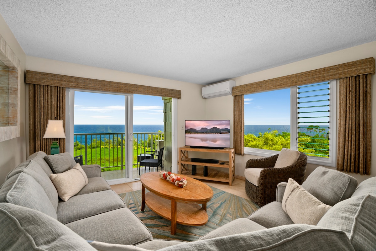 Beautiful corner unit 2BR/2BA penthouse on a quiet green cliff overlooking Anini Reef. Hale Mōlī is paradise away from home. Curated to highlight the surrounding nature, sounds of the ocean fill the unit. Relax, unwind & enjoy cozy luxury at the beach. Private entrance w/ views from every window, AC + fully stocked kitchen. Enjoy sunset over Bali Hai, walk to secluded Sealodge Beach trail, or explore Kaua‘i’s North Shore; snorkeling, hiking, kayaking, dining, & Hanalei Bay are short drive away.