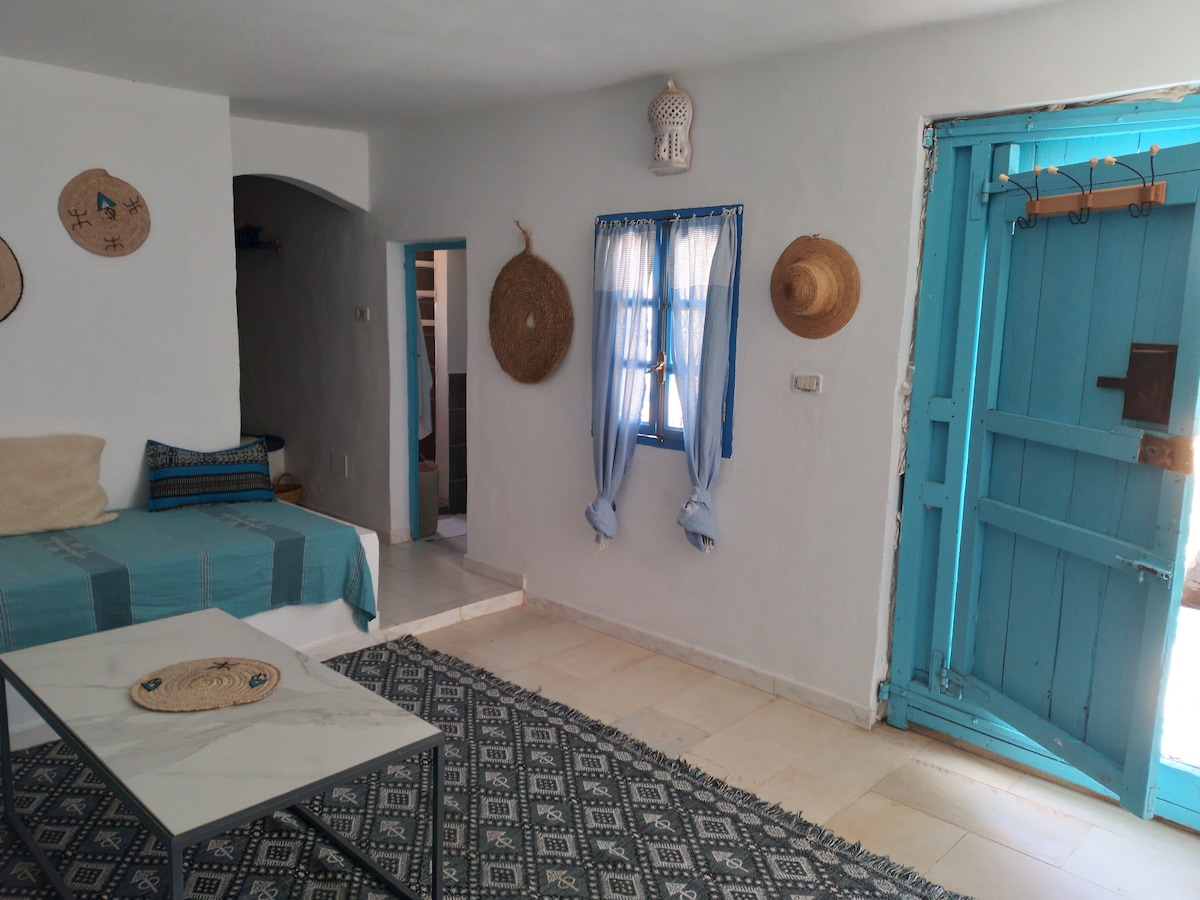 Idealne magiczne miejsce w 🤩 centrum Houmet souk Djerba, aby spędzić najlepsze wakacje na🛫 tej rajskiej wyspie 🏝Dom znajduje się na 1. piętrze z ośmioma schodami. Przy wejściu znajduje się mały taras, salon z małą kuchnią👩🍳, prysznic 🚿i dwie sypialnie z czterema łóżkami🛏. Dom jest bardzo słoneczny ☀️ i dobrze wentylowany tradycyjnymi obrazami🖼. Tuż obok znajduje się 🅿️parking i jest on dostępny dla każdego rodzaju transportu🚊.
