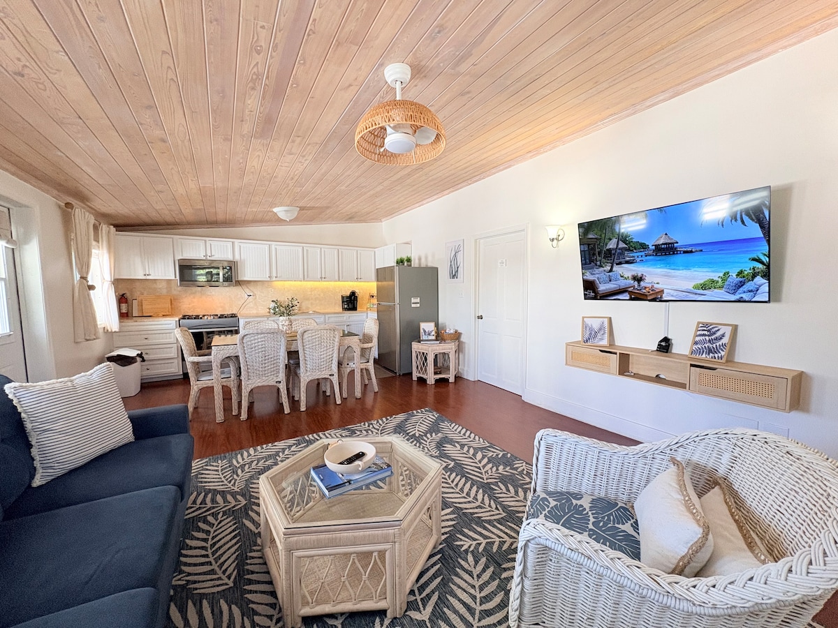 Pirates Den is the main house at Three little Birds. It is a spacious layout with full kitchen plus an outdoor kitchen, vaulted living room, office, king bedroom & office plus a laundry room. It's a short walk to the beach & next to Romora Bay Club & Marina offering live music, bar and restaurants and great sunsets. There are two additional semi-detached rear studio suites with their own entrances that can be rented with the house or independently. The crow’s nest temporary not available.