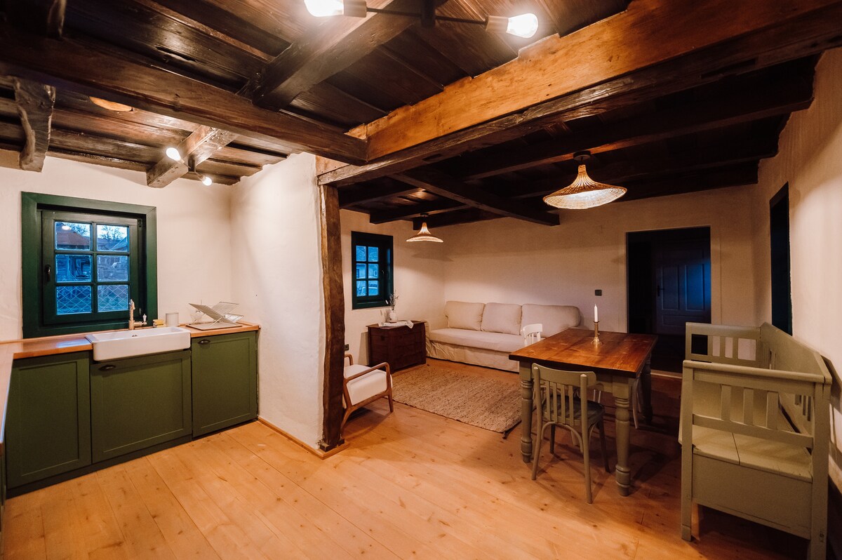 Witamy w naszej ukrytej wiosce, gdzie wiejski urok, autentyczność i przyroda spotykają się z nowoczesnym komfortem. Dom 15 to klasyczny wiejski dom z jedną sypialnią i przebudowaną stodołą z dwiema dodatkowymi sypialniami. Jest to jedno z naszych większych miejsc noclegowych w wiosce, odpowiednie dla rodzin i w zależności od sezonu może pomieścić do 5-6 osób.