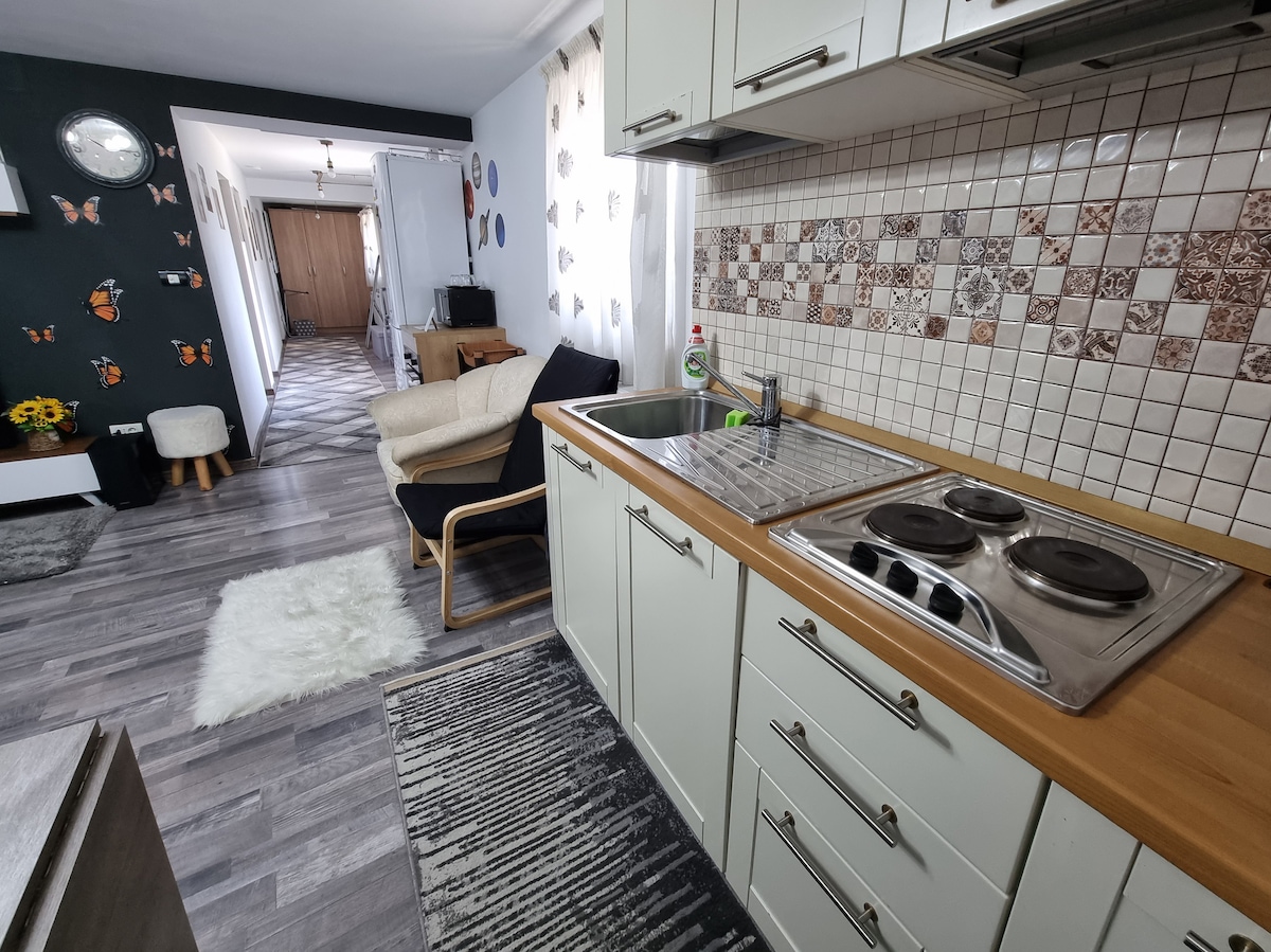 Bucatarie complet utilata, frigider, plita electrica,cuptor mare, cuptor cu microunde,loc de luat masa , vesela. Toate camerele , inclusiv livingul au smart tv.Gratar exterior.WiFi gratuit pe toata proprietatea.Parcare gratuita in curte cu supraveghere video. La nevoie se poate asigura transport in diferite locatii ! Cel mai apropiat supermarket se afla la 800 de metri, cel mai apropiat restaurant la 5 kilometri!