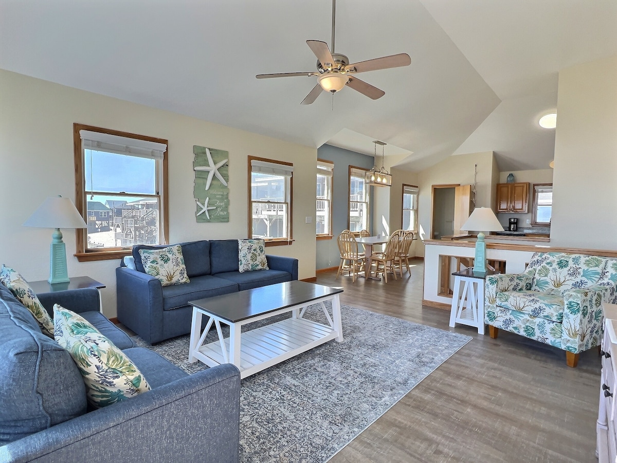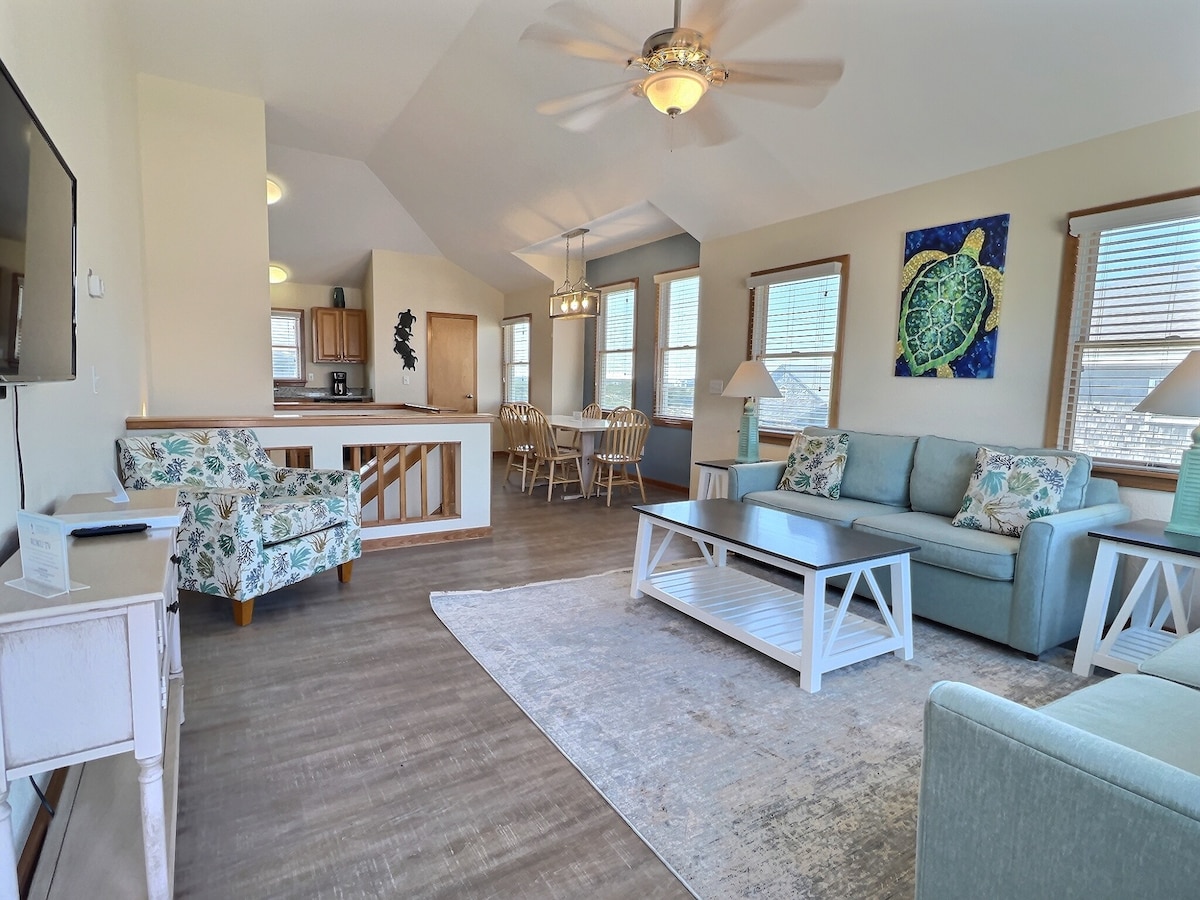 Sea Horse is a bright 2-bedroom side-by-side duplex just 75 yards from the ocean with partial ocean and sound views from upper decks. Sleeping up to 6, it offers a king master suite with a private bath, a queen bedroom, hallway bunks, a hallway bath, a fully stocked kitchen, half bath, and open living space with an oceanside deck. Enjoy resort pool and spa access, private parking, fish cleaning stations, and outdoor hot/cold showers for the perfect coastal getaway.