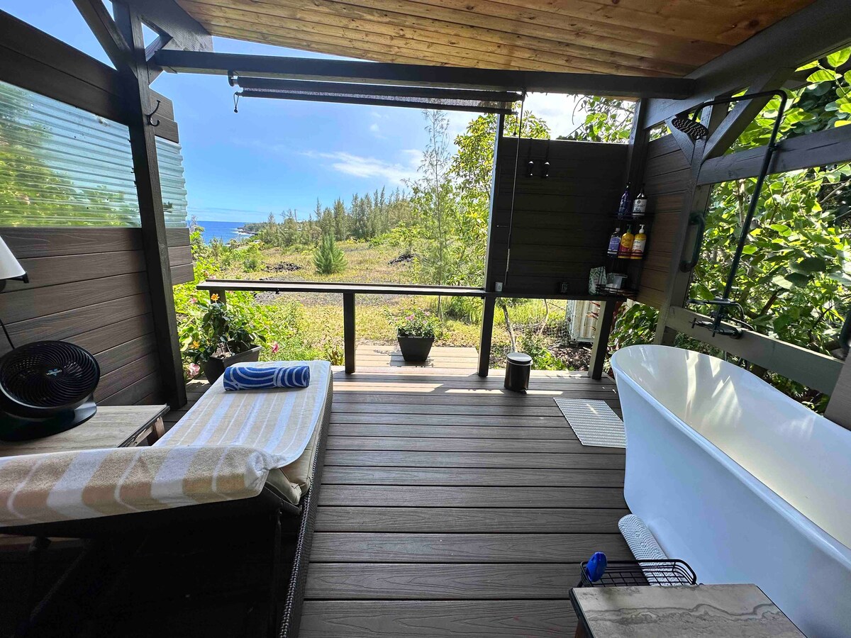 Witaj w Ohia Hideaway – gdzie komfort spotyka się z odpowiedzialnością za środowisko. Obudź się na śniadanie w stylu obsługi pokoju z lokalnymi owocami i domowymi wypiekami w otoczeniu kilometrów bujnego hawajskiego lasu deszczowego. To idealne miejsce, aby podziwiać gwiazdy i zrelaksować się w prywatnej wannie z hydromasażem po całym dniu przygód. Zostań lub odkryj, co ma do zaoferowania urokliwy obszar wulkanu. Możesz spędzać dni oglądając fontanny lawy, wędrując po parku narodowym, odkrywając tunele lawowe, grając w golfa lub odwiedzając winnicę.