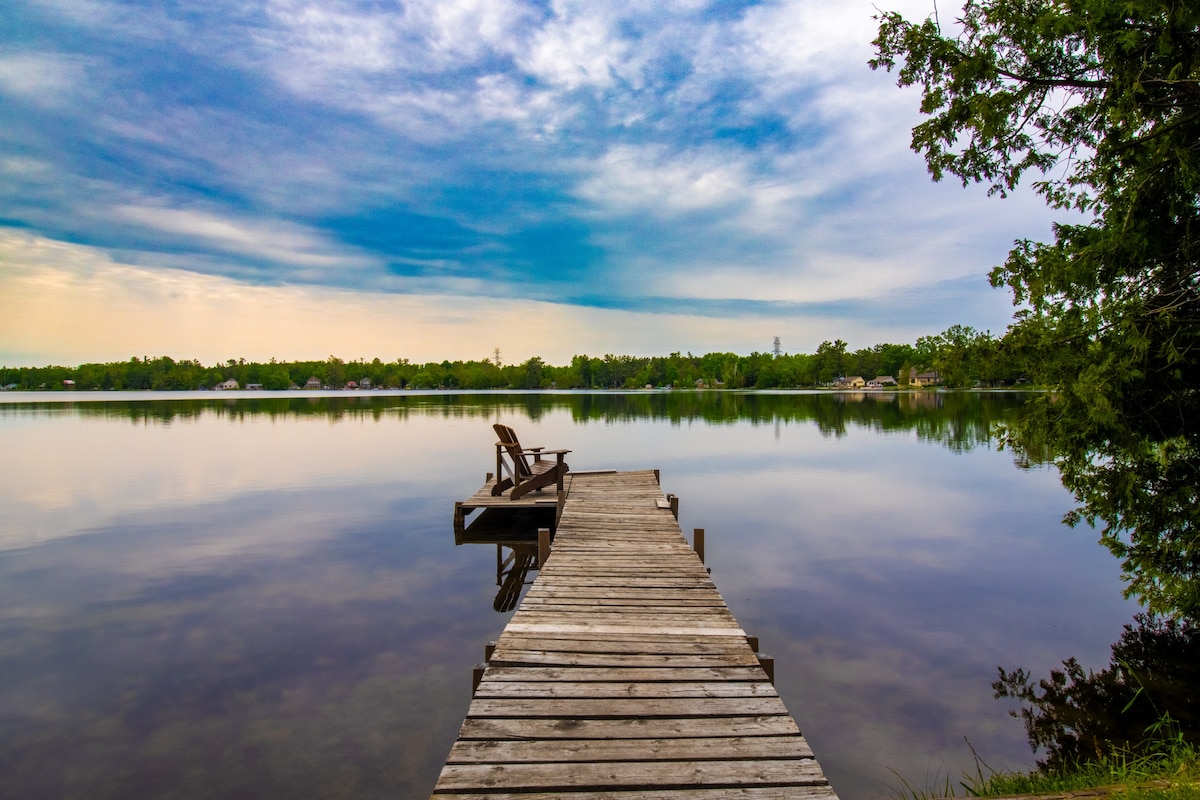 Zaledwie 1 kilometr za Webers na Hwy 11! Przytulny dom nad jeziorem ze wszystkimi udogodnieniami. Ten całoroczny bungalow z 4 sypialniami i 2 łazienkami może wygodnie pomieścić 8 osób i jest idealny na każdą porę roku. Udogodnienia obejmują 2 pełne łazienki, 2 pełne pokoje telewizyjne (1 z podwójną sekcją) i pokój gier z piłkarzykami. Osoba lubiąca przebywać na świeżym powietrzu? Dużo pływania, wędkowania, łodzi wiosłowych, kajaków, czytania lub kieliszka wina nad wodą. Również zaledwie 15 minut od Casino Rama!