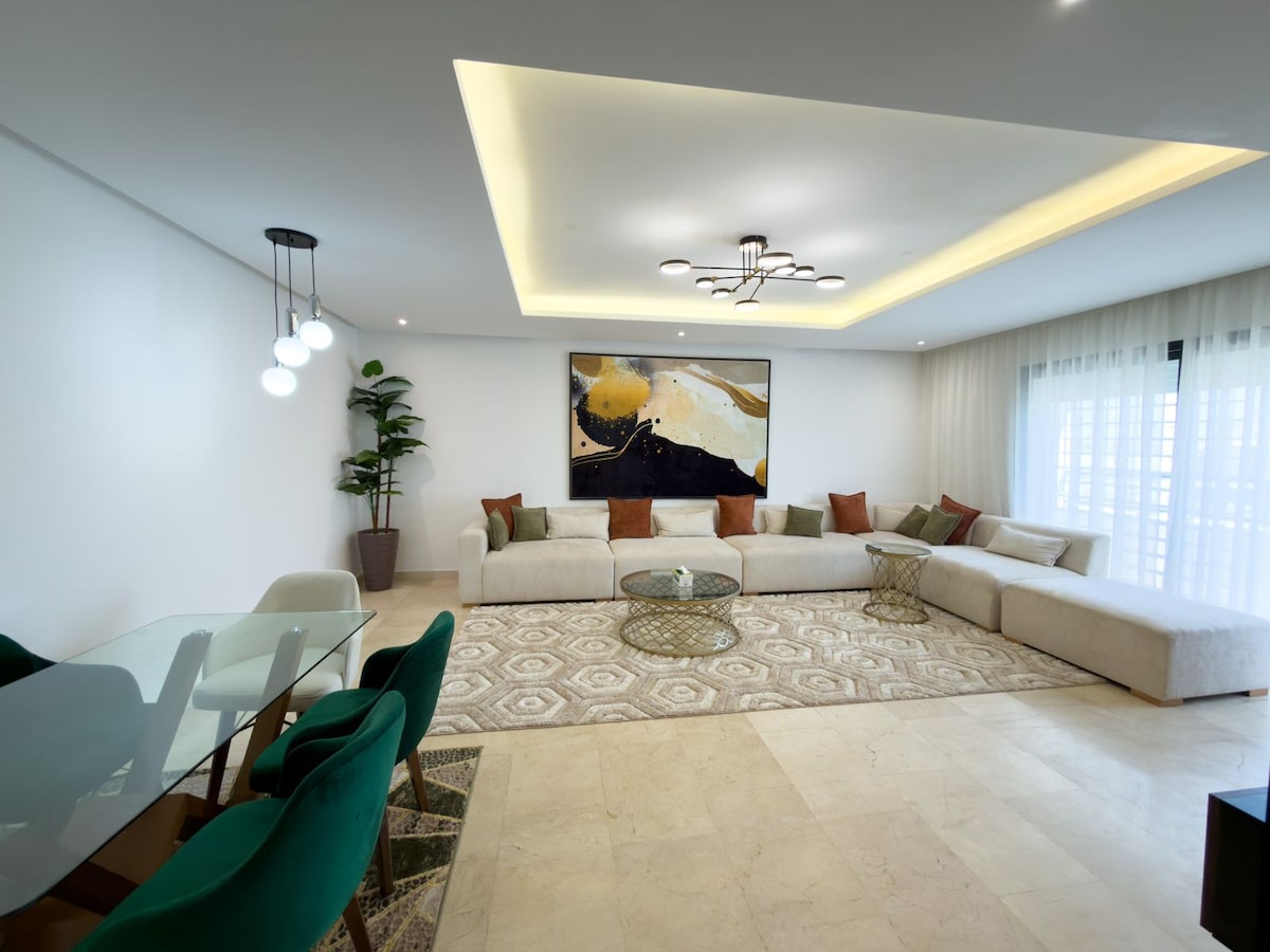 Elegancki apartament o powierzchni 90 m² z przestronnym salonem i dużą sypialnią główną. Przestronne i wygodne, idealne dla par, rodzin i osób podróżujących służbowo ✅ Samodzielne zameldowanie przez całą dobę ✅ Tarasy na terenie całego obiektu ✅ Bezpieczne miejsce zamieszkania + parking ✅ Wi-Fi / Netflix / IPTV ✅ Wyposażona kuchnia, 2 łazienki 🔆 Panoramiczny widok z głównej sypialni Strategiczna lokalizacja: tylko 5 minut spacerem od stadionu Prince Moulay Abdellah, idealna na mecze CAN 2025