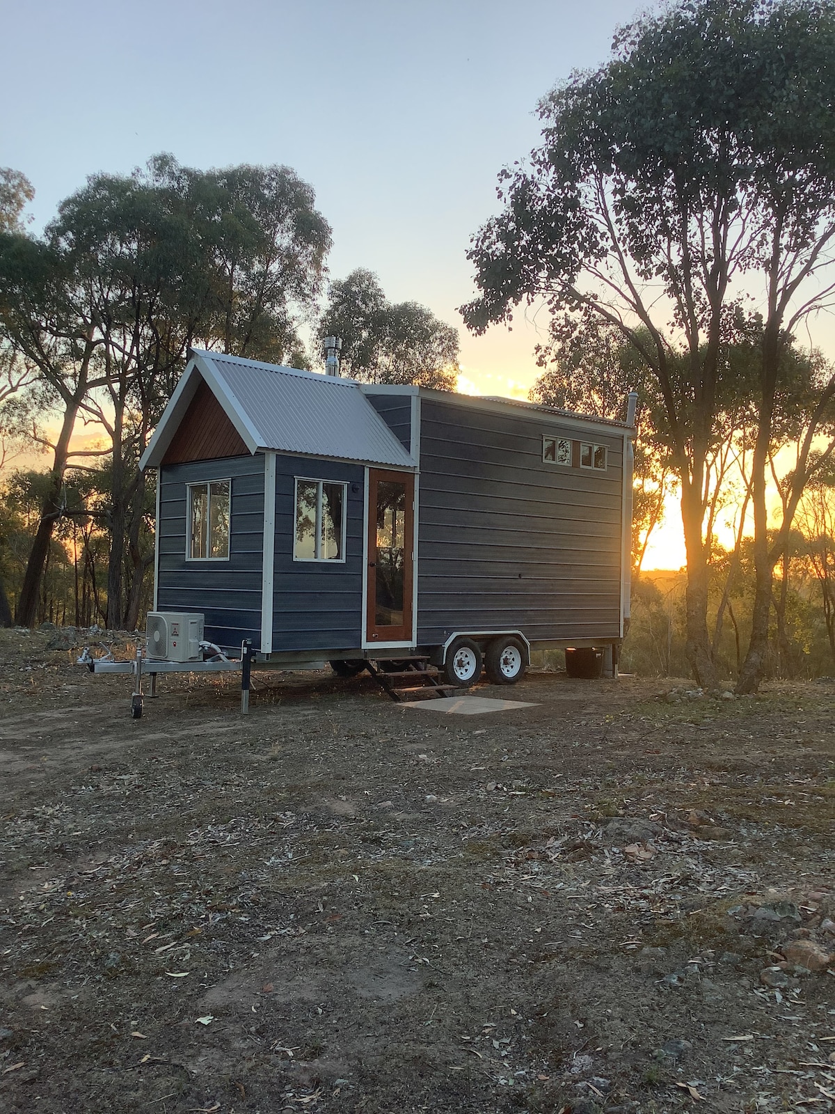 Idealna romantyczna ucieczka. Mały domek na zamówienie położony pod drzewami eukaliptusowymi z widokiem na ogród w stylu wiejskiego domku. Z aneksem kuchennym, własną łazienką i łóżkiem w stylu loftu, ma wszystko, czego potrzebujesz, aby spędzić wyjątkowej nocy. W tym palenisko + jadalnia na świeżym powietrzu, wraz z piecem na drewno w środku, idealne na każdą porę roku. Śniadanie składające się z jajek, chleba, mleka dostarczanego na pobyty od piątku do niedzieli. Łóżko na poddaszu jest na górze drabiny. Na terenie obiektu mamy pawie, psy, minikozy i drób.