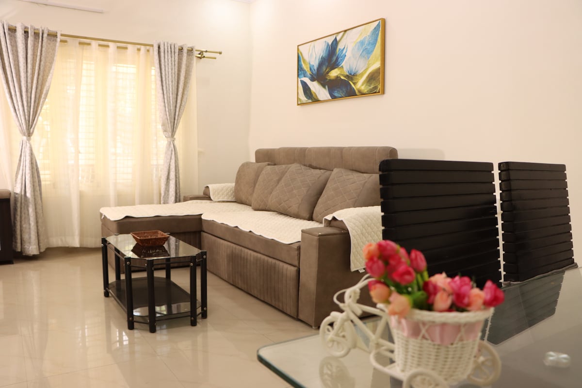 Witamy w naszym nowym, przestronnym apartamencie 2-BHK, idealnym dla rodzin i par szukających komfortu i wygody. Sypialnie wyposażone są w łóżka typu king/queen size z miękkimi materacami ortopedycznymi zapewniającymi spokojny sen. Zrelaksuj się w dużym salonie z 43-calowym telewizorem Smart TV, błyskawicznym Wi-Fi i wydzieloną jadalnią. Do dyspozycji są dwie super czyste łazienki wyposażone w niezbędne akcesoria kąpielowe. W pełni wyposażona kuchnia zawiera wysokiej jakości urządzenia i naczynia do kulinarnych przygód.