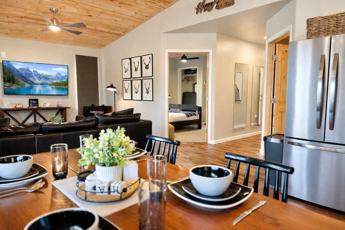 Modern & Cozy, Private Hot Tub, Plenty of Privacy for Couples and Families! Your cozy escape awaits! This modern and cozy cabin is conveniently located within walking distance from Bison Ranch and the soon to be opened Rocky Rim Splash Pad, in Heber Overgaard. This cabin is great for enjoying the natural beauty of nature while having access to some of the best shops and restaurants at Bison Ranch. Perfect location for couples' retreats, family fun and solo trips!