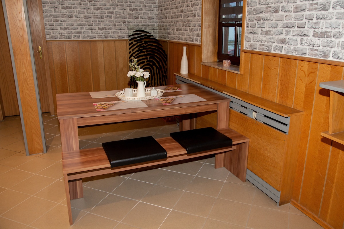 Wynajmujesz mieszkanie z łazienką i aneksem kuchennym w moim domu w spokojnej okolicy na zewnętrznym murze miasta. W wyposażeniu kuchni znajduje się automatyczny ekspres do kawy, kuchenka mikrofalowa, płyta grzewcza Domino oraz lodówka z zamrażalnikiem, a także naczynia dla maksymalnie 6 osób. Przytulny i nowoczesny apartament znajduje się na parterze i ma własny dostęp do ogrodu.