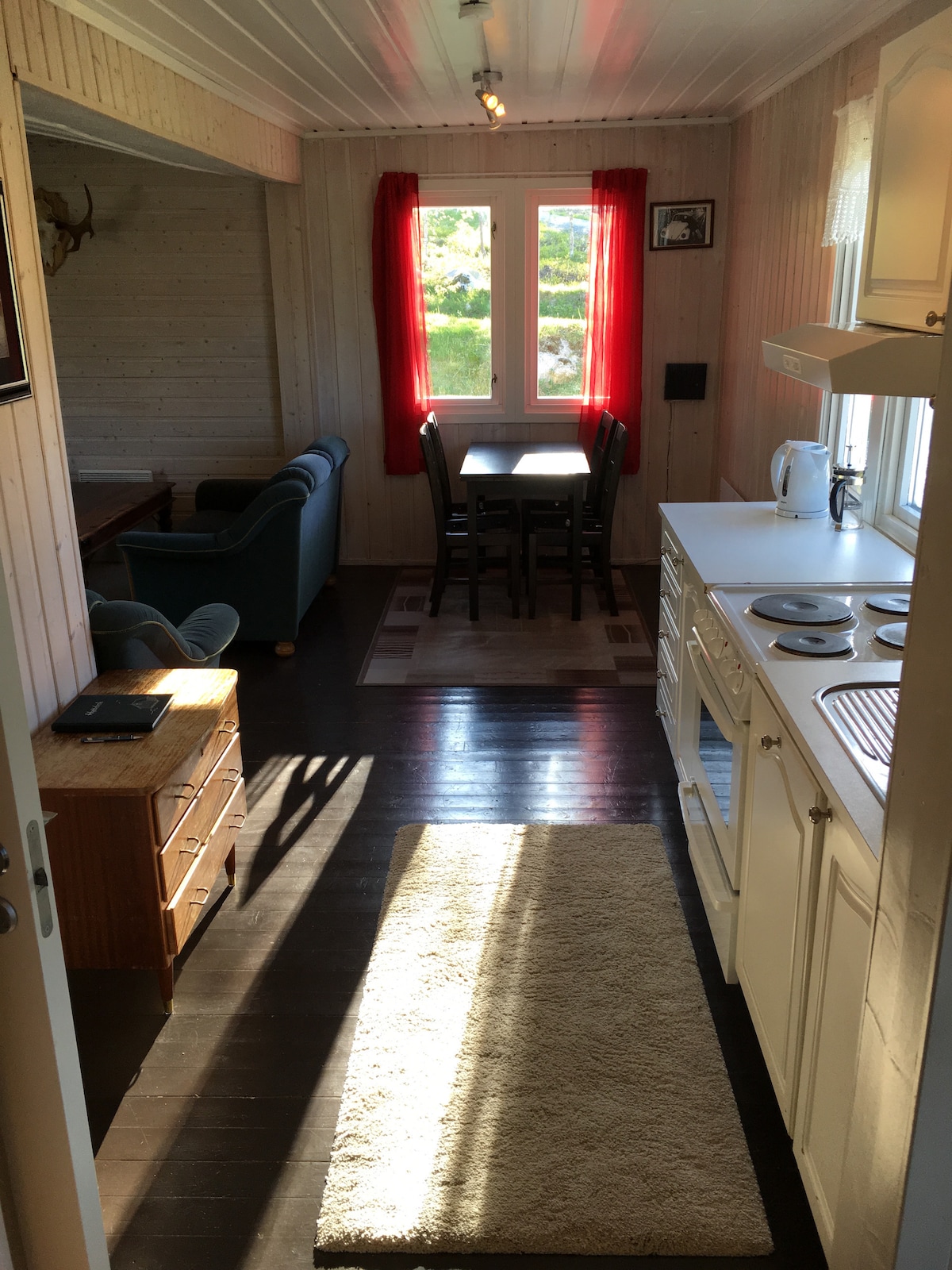 Stary i nostalgiczny nordlandshus z widokiem na morze. Cicha i spokojna okolica, najbliższy sąsiad to hodowla owiec oddalona o 100 m. Na 2 piętrze znajduje się 1 sypialnia, wnęka sypialna na korytarzu oraz loft z miejscem dla 4 osób. Dostęp do plaży i możliwość pływania. Wypożyczalnia łodzi w odległości 1,5 km przez kemping Vennesund. Świetne możliwości pieszych wędrówek zarówno wokół wyspy, jak i w górach