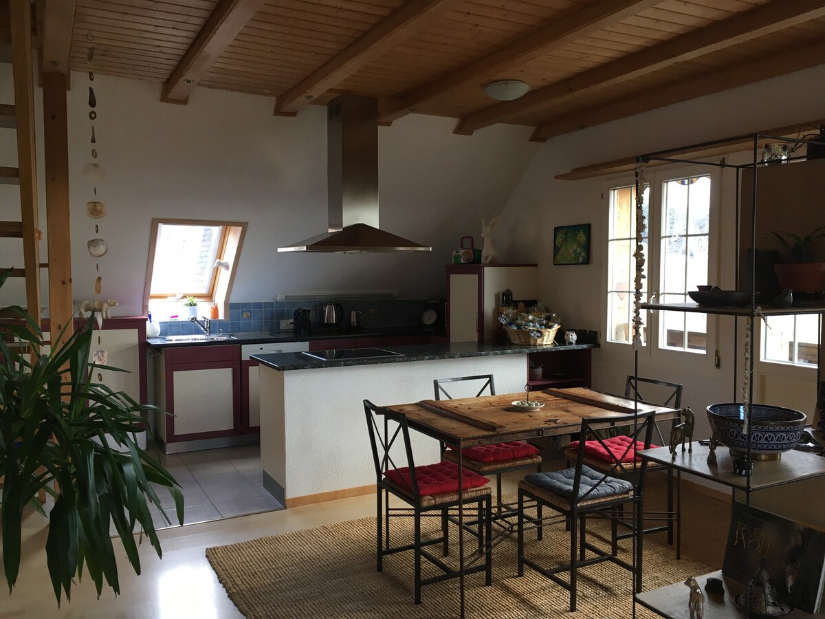 Przytulny i nowoczesny apartament z panoramicznym widokiem na jezioro Thun znajduje się na parterze nowo odnowionego domu wakacyjnego. Znajduje się w spokojnej części wioski i jest punktem wyjściowym dla wycieczek w góry i nad jeziora. Idealny dla 4 osób. Taras z widokiem na jezioro i 2 leżakami, duży grill z 1 skrzynią drewna W tym mapa panoramiczna (różne zniżki) W pobliżu: dworzec autobusowy Krattigen Dorf/Post (4 minuty pieszo), sklep, boisko sportowe, szlaki turystyczne, Thun, Spiez, Aeschi, Interlaken, Beatenberg, Berno