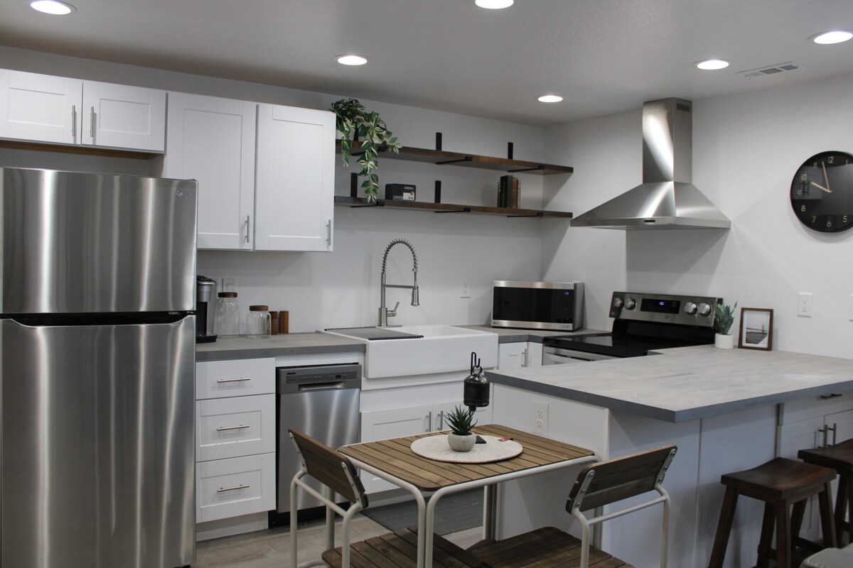 Odpręż się i zrelaksuj w tej spokojnej, stylowej przestrzeni. Położone w centrum Ogden, miasto znajduje się około 5 minut drogi, a ośrodki wypoczynkowe w odległości 30-45 minut. Położone w spokojnej i bezpiecznej okolicy, to miejsce ma wszystko, czego potrzebujesz podczas pobytu; wyposażone w aneks kuchenny, pralkę/suszarkę, łazienkę, łóżko typu queen murphy, stół jadalny, część wypoczynkową, biurko, Wi-Fi, telewizję kablową i bezpłatny parking w pobliżu prywatnych drzwi wejściowych. Bez opłat za sprzątanie! Goście mają również dostęp do zewnętrznej zagrody dla podróżujących zwierząt, które potrzebują rozciągnąć się.