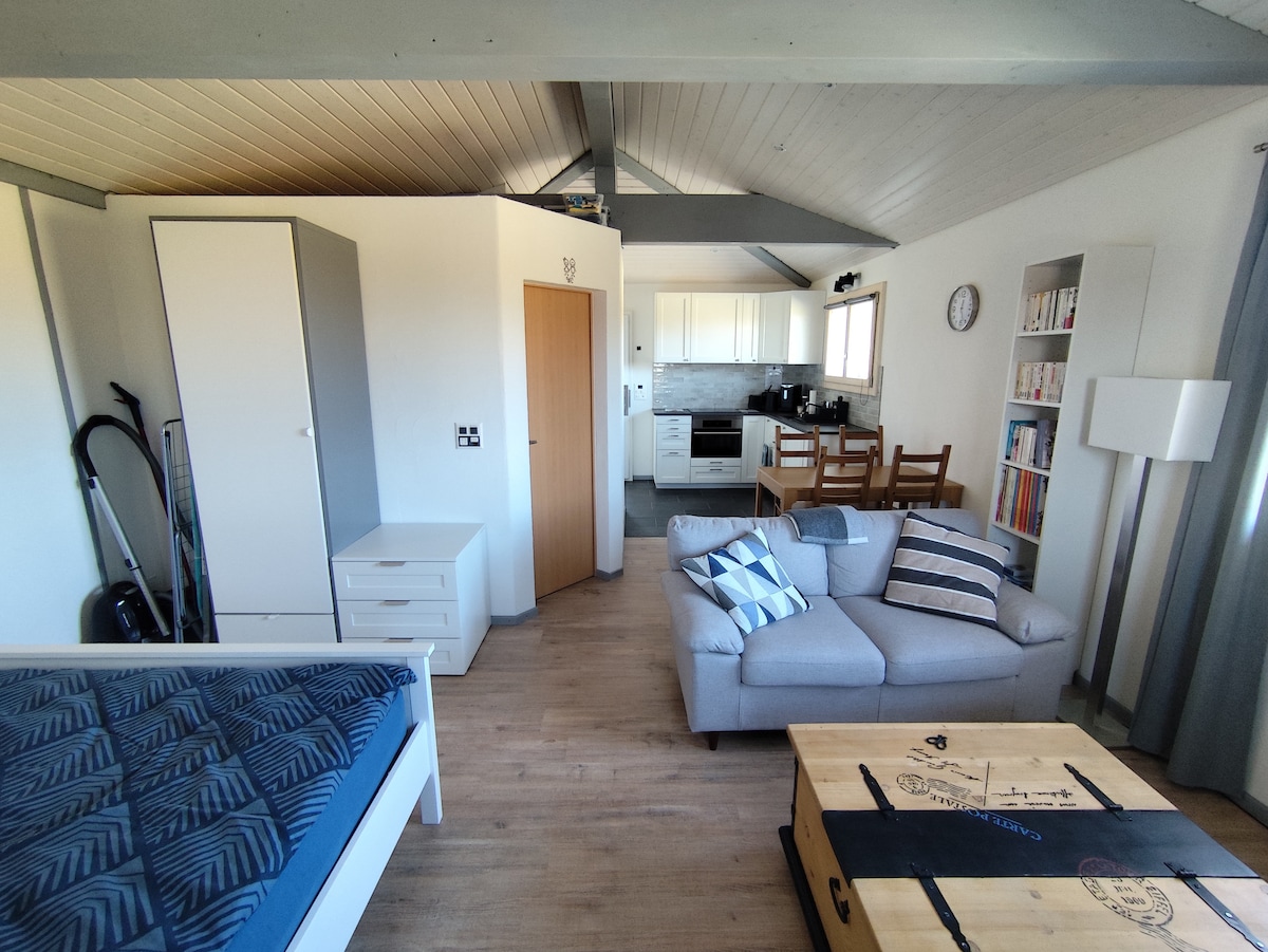 Un logement au charme unique au cœur du Vully Bienvenue dans ce studio au style unique, fraîchement construit et idéalement situé à Salavaux. Pensé pour votre confort, il vous accueille pour un séjour chaleureux, entre authenticité et modernité. Parfaitement équipé, pratique et agréable, ce cocon est le point de départ idéal pour explorer les trésors de la région du Vully. Entre lacs, collines couvertes de vignes et paysages à couper le souffle, vous aurez l’embarras du choix pour vos escapades