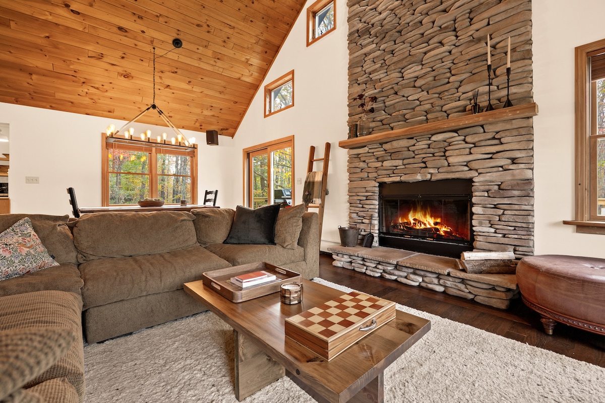 Położona w spokojnym lesie Saugerties w Nowym Jorku, ta luksusowa chatka w kształcie litery A oferuje nowoczesny komfort i naturalne piękno. Zaledwie 10 minut od Woodstock i 2 godziny od Nowego Jorku, NJ. Znajduje się na prywatnej działce o powierzchni 2 akrów. Łatwy dostęp. Materace premium queen Casper, ekspres do kawy Breville, projektor 4K, palenisko, grill, cedrowa wanna z hydromasażem opalana drewnem i sauna. Przyjazne dla psów! Przytulne i stylowe miejsce na wypoczynek w pobliżu szlaków turystycznych, tras narciarskich i najlepszych restauracji w Catskills. Odwiedź nasz profil na Instagramie „highwoodsaframe”, aby dowiedzieć się więcej!