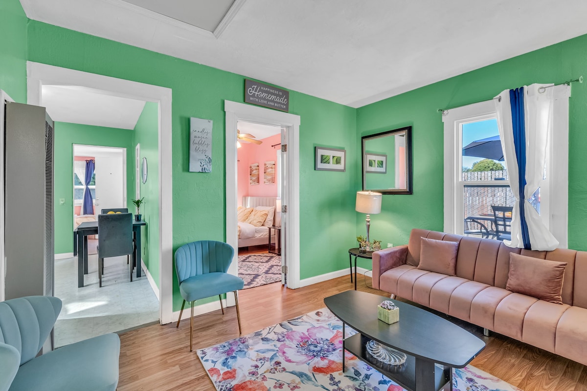 Przyjdź i ciesz się tym 1-osobowym apartamentem. Przytulna i jasna sypialnia z wygodnym łóżkiem typu Queen. Salon składa się z wydzielonej jadalni i strefy relaksu z sofą i telewizorem. W aneksie kuchennym znajduje się kuchenka mikrofalowa, mały piekarnik i ekspres do kawy, ale nie ma KUCHENKI. Nowo zainstalowane ogrzewanie i klimatyzacja. Apartament ten jest częścią domu jednorodzinnego. Pozostała część domu jest również wynajmowana jako lokal Airbnb, ale z oddzielnym wejściem. Taras jest wspólny. Wejście jest na podwórku.