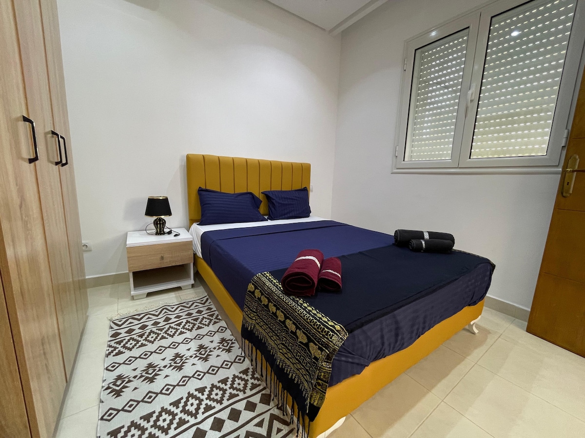 Beautiful and fully furnished apartment 5 minutes walk from beach. The location is perfect, between the touristic zone, the beach and the old city (Medina). Everything can be reached by walking including restaurants, shops, supermarkets, bars, the beach and souk. Safe neighborhood for evening strolls and nights out. This 80-square-meter apartment has 2 bedrooms, a living room, kitchen, dining room, bathroom and a balcony. The entire flat, living room and two bedrooms has air conditioning
