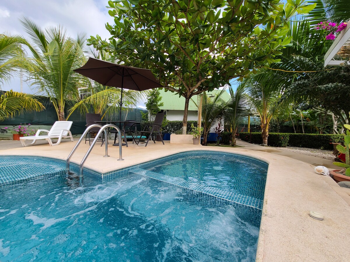 Spokojny wypoczynek w Jaco w pięknych ogrodach tropikalnych Zapraszamy do skorzystania z naszej jednoosobowej Casity na idealny wypoczynek w Jaco. Możesz cieszyć się w pełni niezależnym domem z własnym prywatnym basenem (basen nie jest współdzielony), prywatnym parkingiem, w pełni wyposażoną kuchnią ze zmywarką i klimatyzacją (sprawdź nasze zdjęcia, aby zobaczyć basen, ogrody i jak prywatny jest dom).