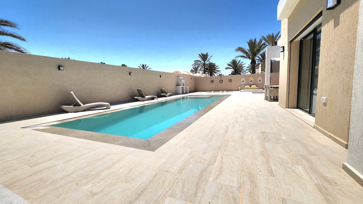 🌴 Bienvenue à Villa Eden – Votre parenthèse de tranquillité sous le soleil de Djerba ✨ Les espaces • 190 m² de confort moderne et raffiné • 3 grandes suites avec literie haut de gamme • 3 salles de bain, 🌿 Le jardin et la piscine • Piscine privée sécurisée • Terrasse avec salon extérieur et transats • Espace barbecue pour vos repas conviviaux 🏡 Équipements • Cuisine entièrement équipée (four, micro-ondes) • Climatisation dans toutes les pièces • Wifi haut débit • Machine à laver