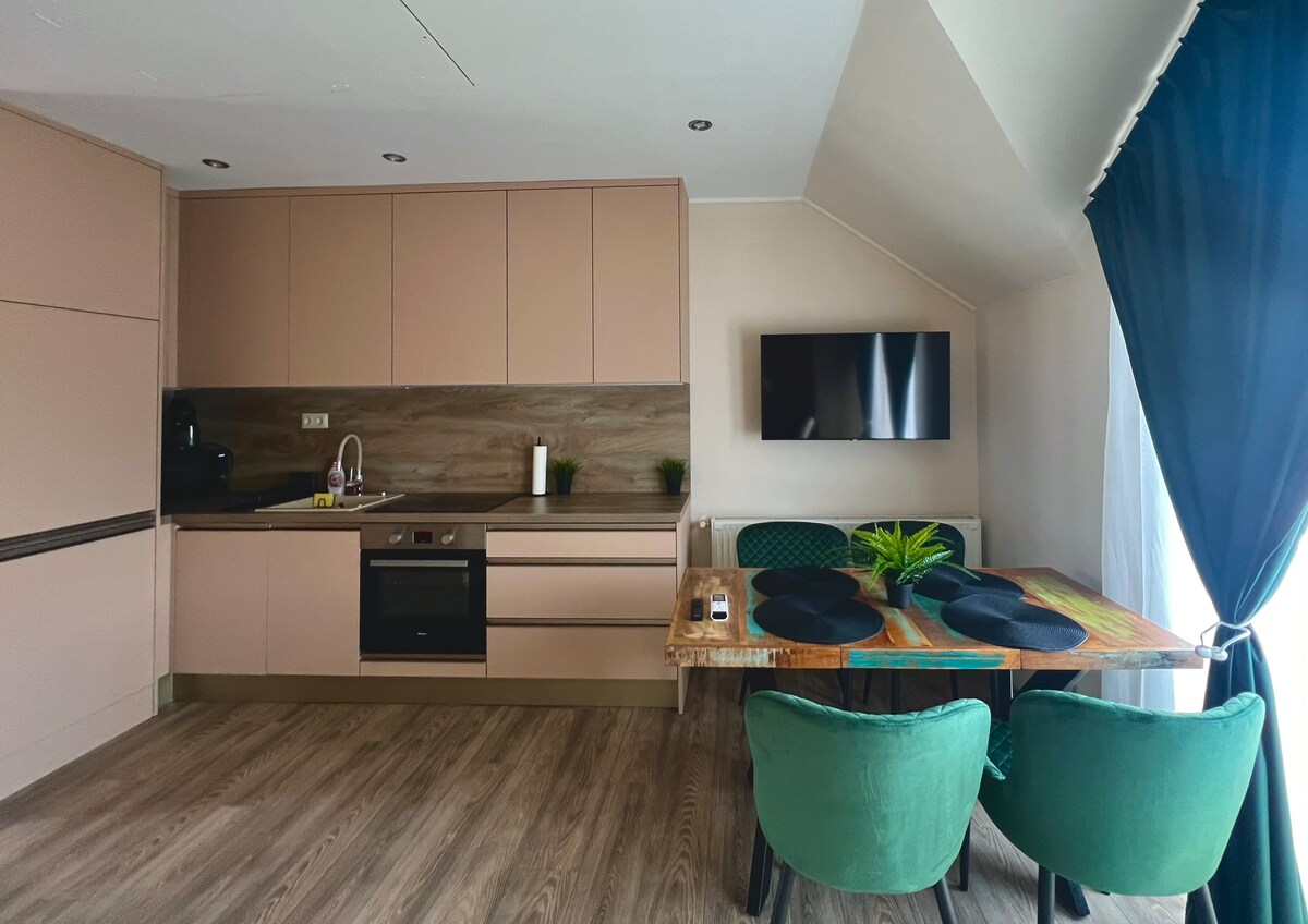 Ennek az egyedi helynek saját stílusa van. Távol a város zajától, madárcsicsergős, csendes, erdei elhelyezkedés, exkluzív belső kialakítás, egyedi tervezés. Kültéri finn szaunával, jakuzzival.