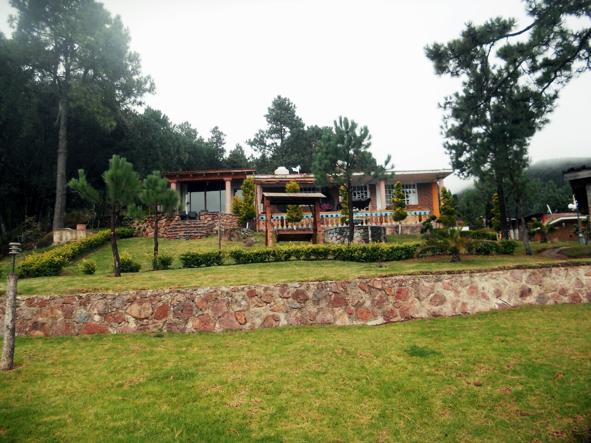 Es un bello lugar en donde podrás escuchar el trino de los pájaros,llenarte de oxígeno,caminar por senderos seguros, meditar en medio de el bosque,ver contentos a tus hijos jugando y corriendo por nuestras 10 hectáreas de jardines, prender una fogata en la noche para disfrutar de la inmensidad de las estrellas , platicando y asando bombones con tu familia y amigos , traer a tu mascota para que corra y ejercite también ellos tiene derecho, tenemos una vista impresionante con un servicio exelente