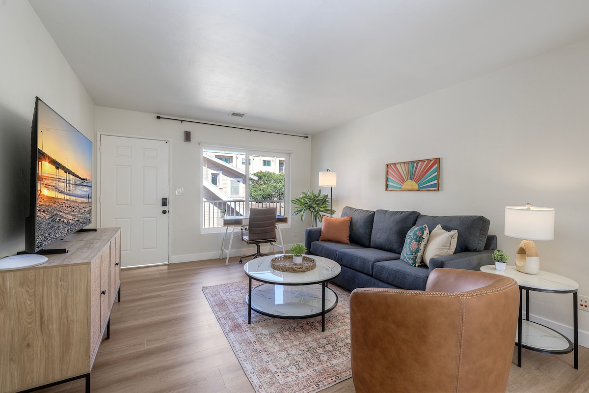 Enjoy the ultimate comfort in this beautifully remodeled condo in Pacific Beach. Smart TVs in every room, flooded with natural sunlight, refreshing ocean breeze and the perfect location— just two blocks from the bay beach, playgrounds, beach fire pits, and the boardwalk. The vibrant main street of PB (Garnett Ave) and the ocean are less than a mile away. Provided are beach chairs, towels, surfboards and boogie boards for you to use. Beds are new (2023) - 1 memory foam and 1 hybrid.