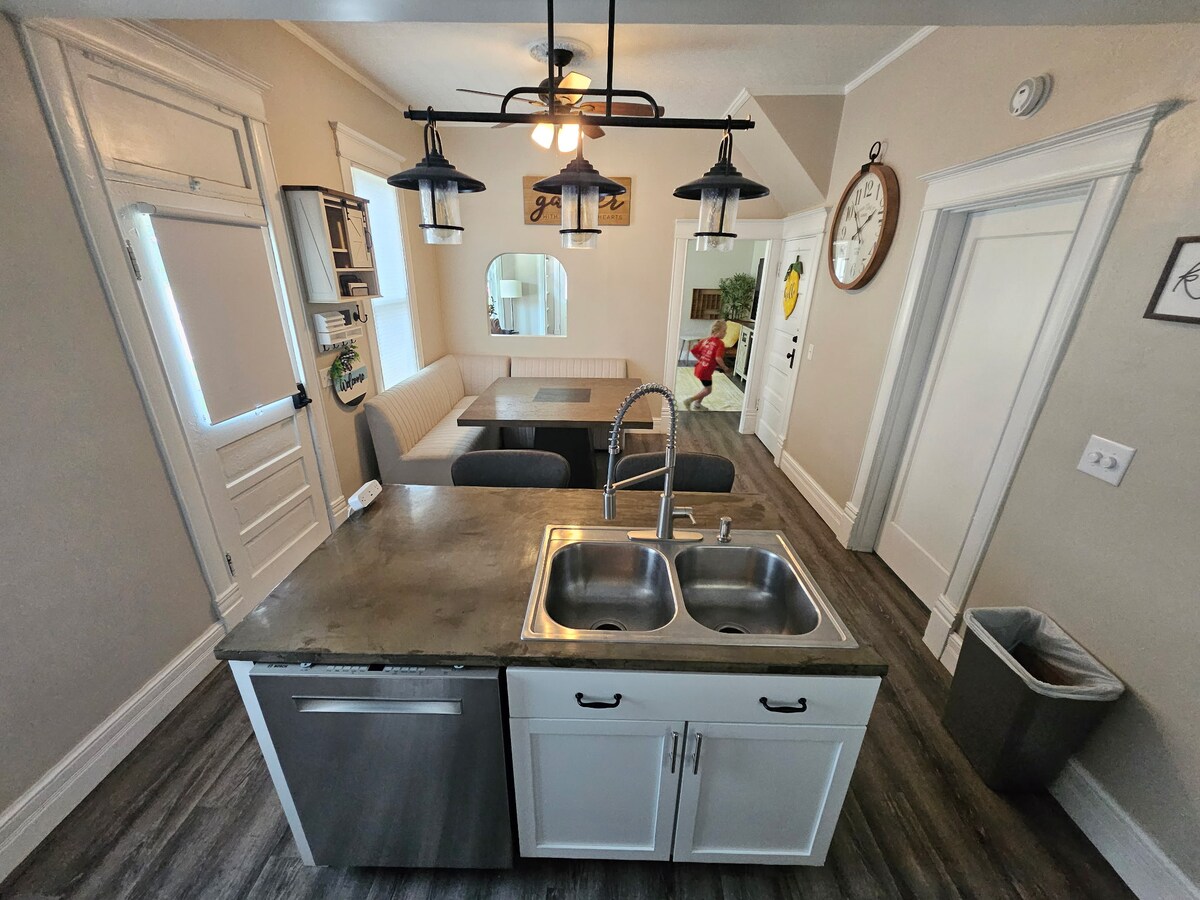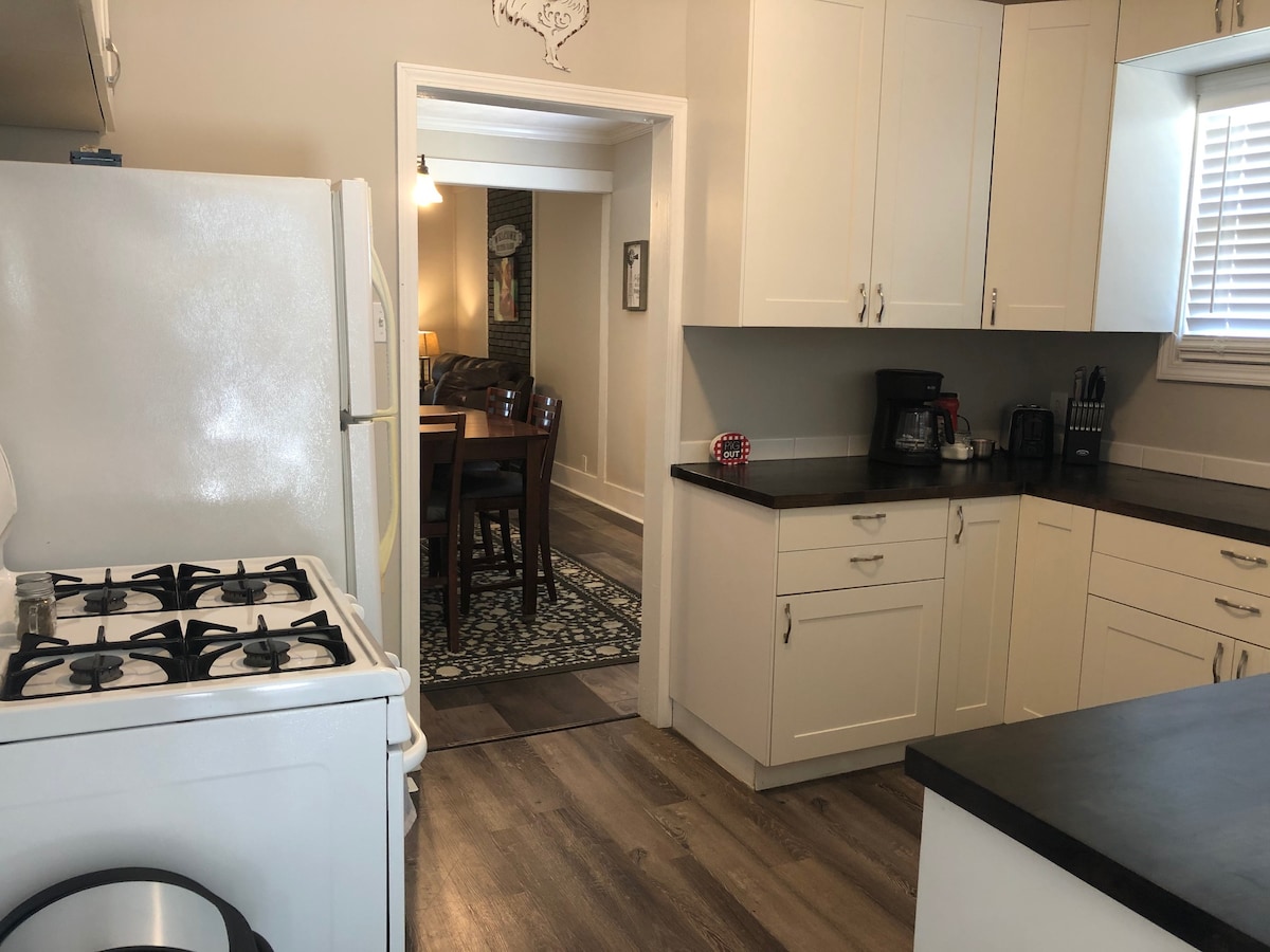 Witamy w naszym domu Hilltop Ranch! Znajdziesz tu relaksujący wypoczynek dla całej rodziny lub kilku par. Na pierwszym piętrze znajduje się 1800 stóp kwadratowych, w tym główna sypokój z łazienką z wanną z jacuzzi, w pełni wyposażoną kuchnią, kominkiem gazowym i dołączonym garażem na 2 samochody. W piwnicy znajduje się czwarta sypialnia, pełna łazienka i strefa telewizyjna. Patio przylegające do jadalni, grill na węgiel drzewny i pełnowymiarowa wanna z hydromasażem – wszystko idealne do zabawy dla całej grupy.