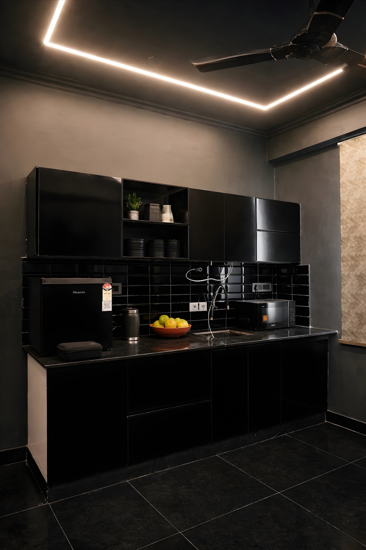 Witamy w naszym luksusowym miejskim studio, oazie stylu i wyrafinowania w tętniącym życiem sercu Gurgaonu. Wyjątkową cechą naszego loftu jest specjalna czarna kolorystyka, która dodaje przestrzeni elegancji i dramatyzmu, dzięki czemu Twój pobyt będzie komfortowy i oszałamiający. Gdy wejdziesz do naszego elegancko urządzonego apartamentu typu studio, przywita Cię widok naszych pluszowych czarnych foteli rozkładanych. Te dwa luksusowe fotele rozkładane są centralnym punktem, oferującym idealne połączenie współczesnego wzornictwa i wyjątkowego komfortu.