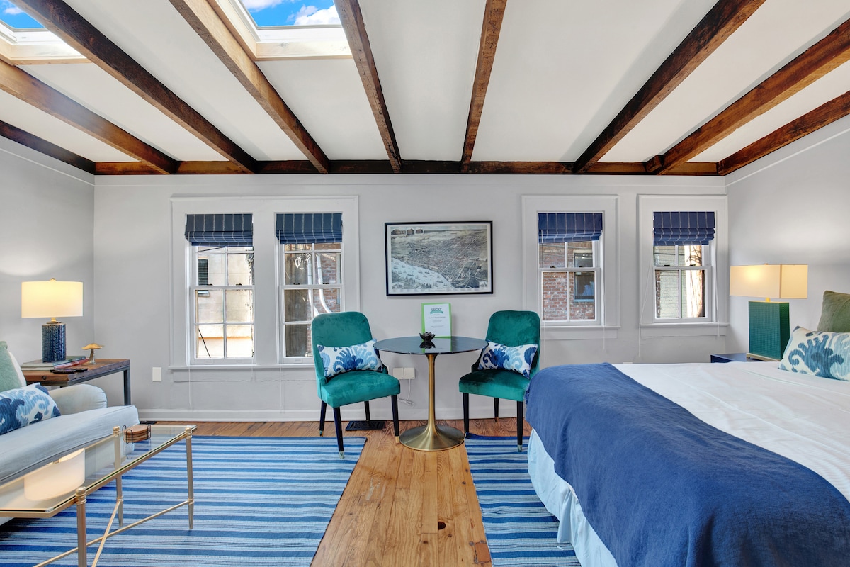 Witamy w The Blue Oyster w Drayton Tower, stylowym i pomysłowym mieszkaniu położonym na 6 piętrze jednego z najbardziej kultowych budynków z połowy wieku w Savannah – Drayton Tower przy 102 E. Liberty Street. Ten nowoczesny dom z widokiem na wieżę, lokalnymi muralami i luksusowym fotelem do masażu oferuje idealną równowagę między komfortem, kulturą i wygodą. Niezależnie od tego, czy wybierasz się na romantyczny weekend, podróż służbową, czy odkrywasz urok Savannah ze znajomymi, czeka Cię uczta!