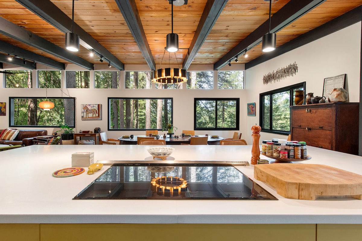 **Recently refreshed/re-furnished!** This house was named 'The Ranch House' by its architect Don Jacobs, this updated 70s cabin is a forest getaway with modern sensibility. The house is surrounded by redwoods & has 2 large decks, 1 w/ propane firepit w/ ample seating, the other w/ hot tub. Living room has picture windows w/ forest views & Morso wood-burning stove. Guests are encouraged to enjoy the hiking trails, pools, and outdoor amenities. House comfortably sleeps 4, plus fiber-optic internet