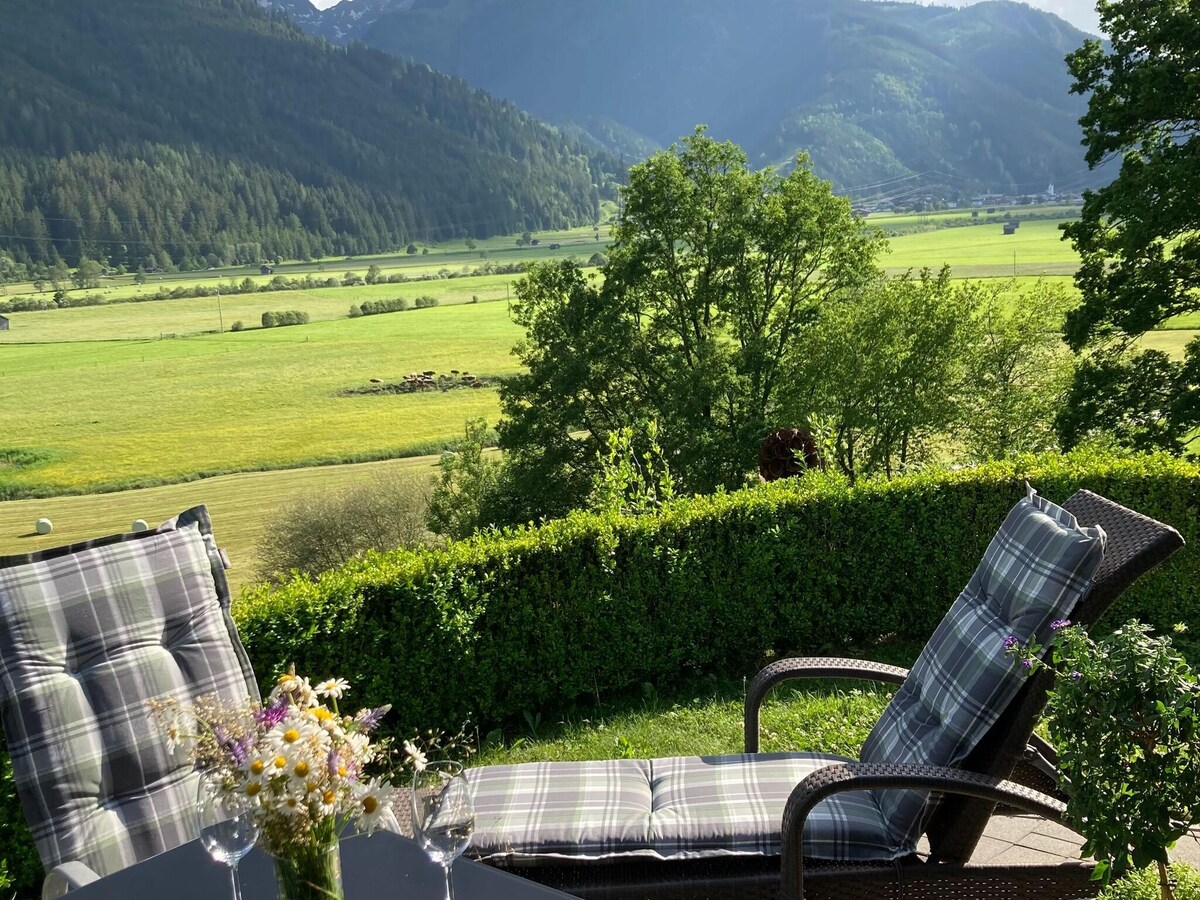 Our family-run organic farm is situated 985 m above sea level with a beautiful view on the alps. We are surrounded by skiing areas: Zell am See-Schmittenhöhe, Kaprun-Kitzsteinhorn, Kitzbühel, Saalbach-Hinterglemm and Leogang. In addition, the Krimml Waterfalls and the Grossglockner High Alpine Road are close. The apartment is situated on the bottom floor of the farmhouse. It has its own entrance and a cosy sheltered patio with a great view that is situated directly next to a big garden.