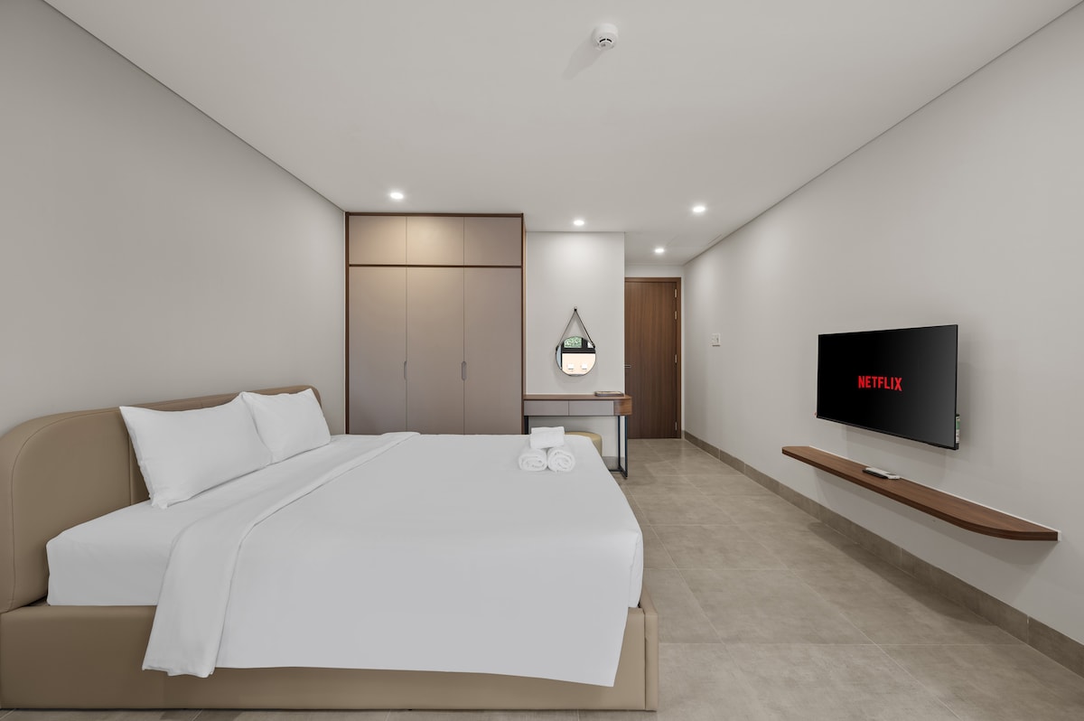 Overlooking the Han River and Da Nang’s iconic bridges, this spacious 110m² apartment offers a peaceful retreat above the city. Located on lively Bạch Đằng Street, opposite the river and just a short walk from Han Market, guests can enjoy Dragon Bridge’s fire show at 9PM on weekends from their own balcony. Designed in deep navy tones with warm wood finishes, the home feels calm, refined. Daily housekeeping, free pool, gym, table tennis make it ideal for families, business travelers, long stays.
