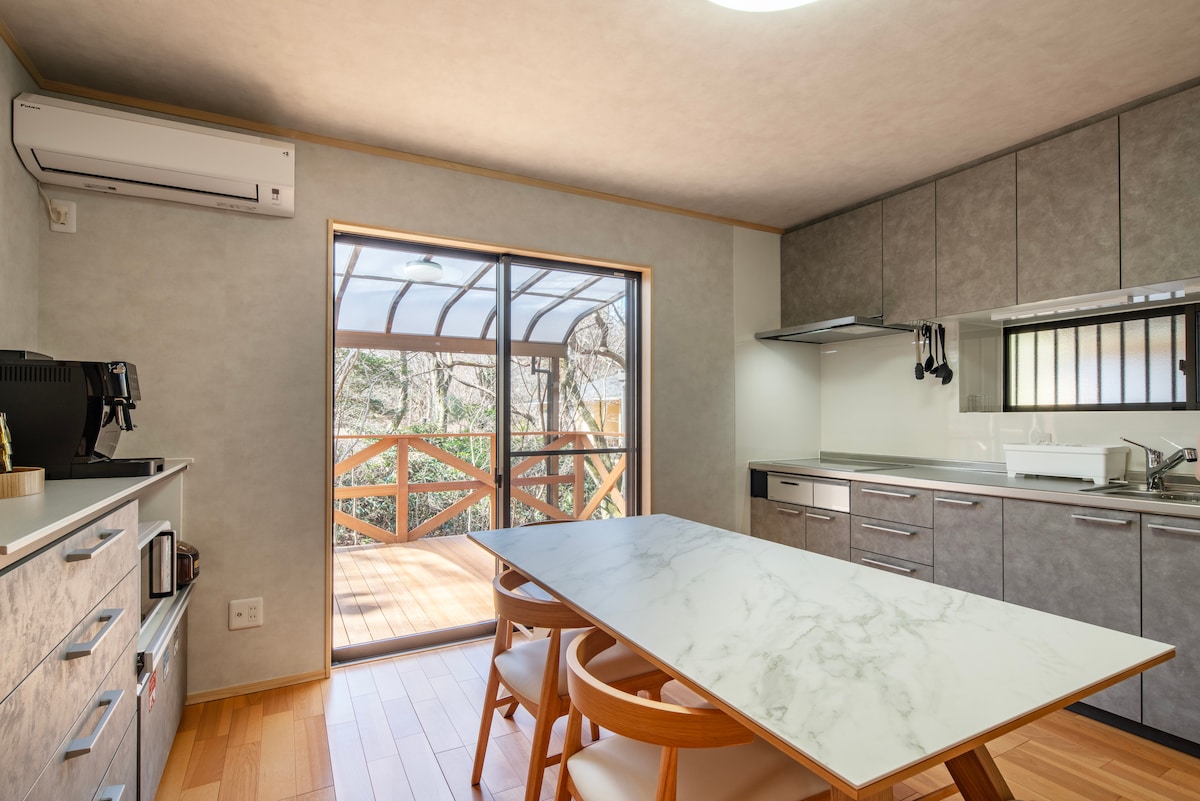 Koti hakone in Hakone's scenic Sengokuhara luxury villa district is the perfect 2-3 night getaway-serene privacy away from crowds, famous local restaurants just minutes away, plus on-site activities: Wewnątrz: salon i jadalnia dla 15 osób, naturalna wanna z gorącym źródłem, kuchnia komercyjna, kryty pokój dziecięcy, 6 sypialni z pokojem zabaw, 4 toalety, dodatkowa kabina prysznicowa (+ 4400 ¥/noc). Na zewnątrz: miejsce do grillowania , palenisko (drewno na opał), park dla dzieci na świeżym powietrzu, autentyczna sauna(+ 5500 ¥/noc) i taras relaksacyjny.