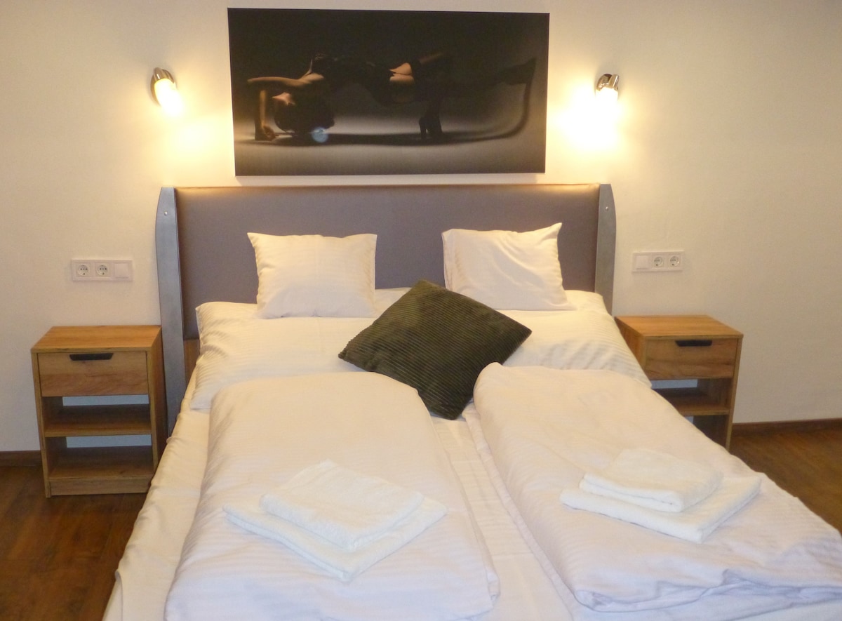 Ciesz się i delektuj swoim pobytem w otoczeniu oryginalnych mebli wschodnioeuropejskich, tak typowych w stylu, który był bardzo popularny w połowie ubiegłego wieku. Budynek z dziedzińcem pochodzi z 1914 roku i został zbudowany zgodnie ze specyficznymi wymaganiami ówczesnego producenta mebli. Wysoki sufit, drewniane okiennice i drewniane parapety okienne pokazują piękno tego okresu. Siedząc na przytulnym balkonie, popijając kieliszek wina, można zanurzyć się i poczuć klimat miasta.