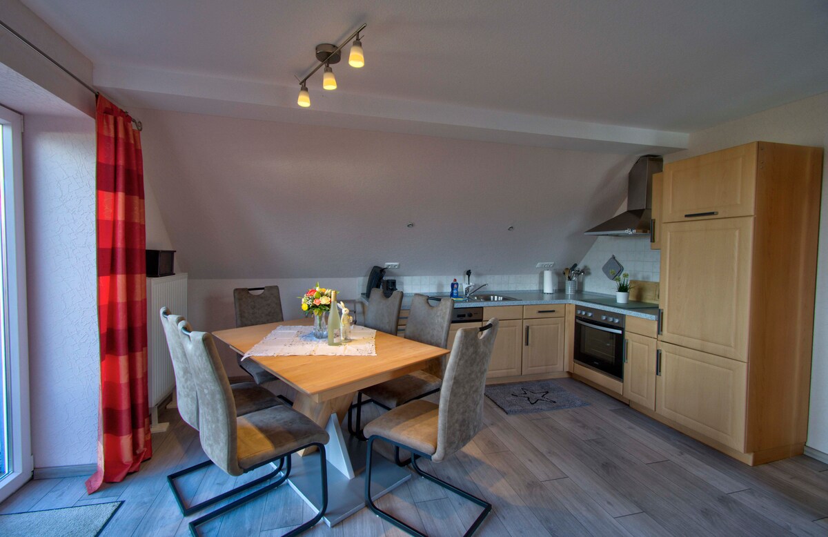 Storchenblick to przestronne mieszkanie, które może pomieścić do 4 osób dorosłych i 2 małe dzieci/niemowlęta. Znajdziesz tu sypialnię z łóżkiem typu king size, antresolę również w sypialni z podwójnym łóżkiem oraz rozkładaną sofą w salonie-jadalni. Dodatkowo do dyspozycji jest łazienka z wanną i prysznicem. Kominek opalany drewnem tworzy wyjątkowy nastrój. Z kuchni można wyjść na taras. Stamtąd roztacza się piękny widok na bocianie gniazdo.