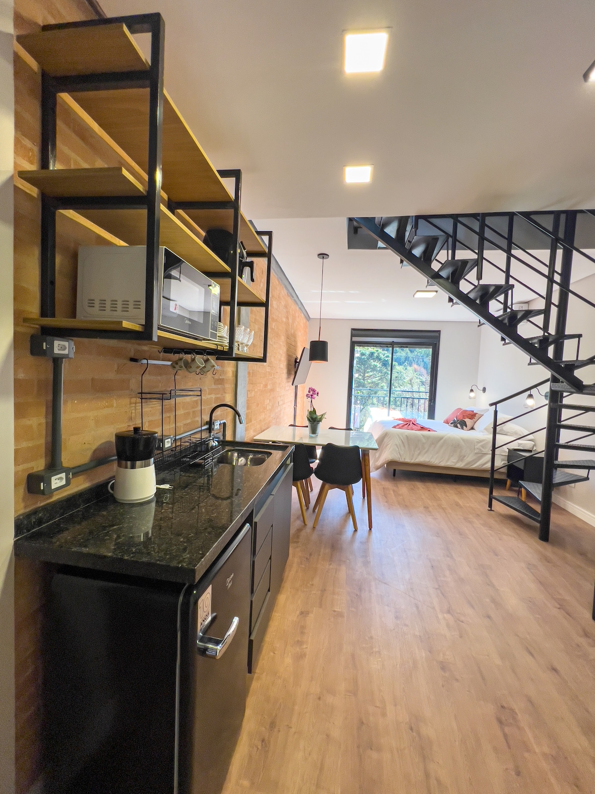 Loft z antresolą, piękna, nowoczesna przestrzeń, dwa łóżka małżeńskie Queem i rozkładana sofa, dwie pełne łazienki, położony bardzo blisko centrum turystycznego Campos do Jordão, wyposażona kuchnia do przygotowywania przekąsek, a nawet małych codziennych posiłków, jesteśmy tylko 700 metrów od centrum Vila Capivari, można dotrzeć tam na piechotę, na dole budynku znajduje się urocza restauracja (Moringa) z pysznymi daniami, serwują tam również śniadania.