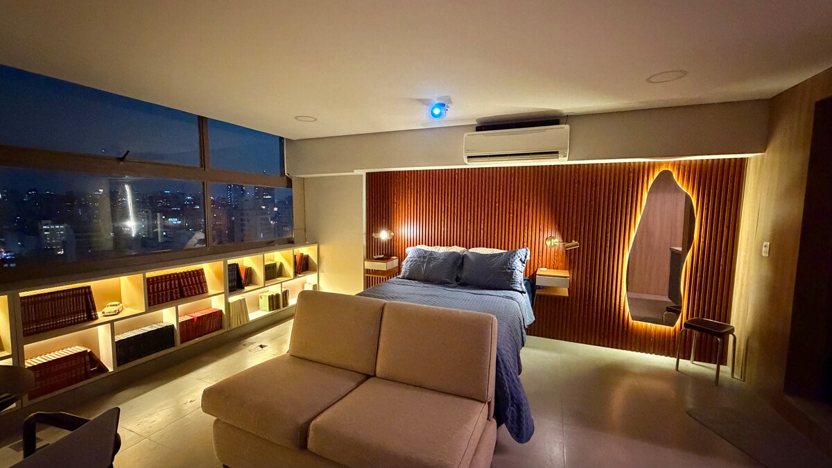 Przestrzeń ze wszystkimi udogodnieniami na krótki lub długi pobyt, cicha, kompletna i wygodna, z widokiem na miasto, z otwartym balkonem na 21. piętrze zabytkowego budynku z lat 50. XX wieku. Wyposażona kuchnia, wanna z hydromasażem, klimatyzacja z funkcją ogrzewania/chłodzenia, ciepła woda, telewizor QLED 50”, kompletny, wysokiej jakości zestaw pościelowy, doskonałe łóżko, miejsce do pracy z internetem Starlink, głośnik Echo-dot z asystentką Alexa – to wyjątkowe miejsce do pracy lub wypoczynku, gdzie można naładować baterie i być blisko wszystkiego, co ciekawe w São Paulo🥂