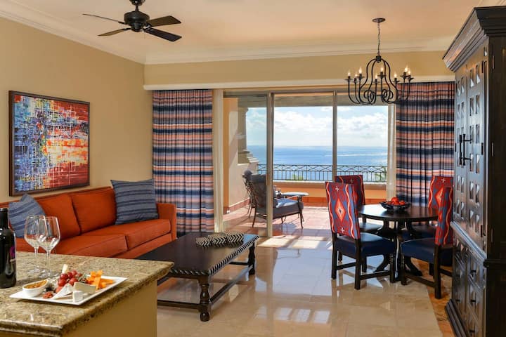 Kiedy rezerwujesz wakacje w Pueblo Bonito Sunset Beach Golf & Spa Resort, otrzymujesz nie tylko piękne miejsce na pobyt, ale całe wakacyjne doświadczenie w wysokiej klasy ośrodku z wyjątkową obsługą i udogodnieniami oraz dostępem do licznych atrakcji i pysznych opcji gastronomicznych. Apartament Executive Suite w ośrodku to luksusowy apartament z gwarantowanym tarasem z widokiem na ocean, 2 dobrze wyposażonymi łazienkami, dobrze wyposażonym aneksem kuchennym z lodówką/zamrażarką, kuchenką, kuchenką mikrofalową i jadalnią wewnątrz/na zewnątrz.