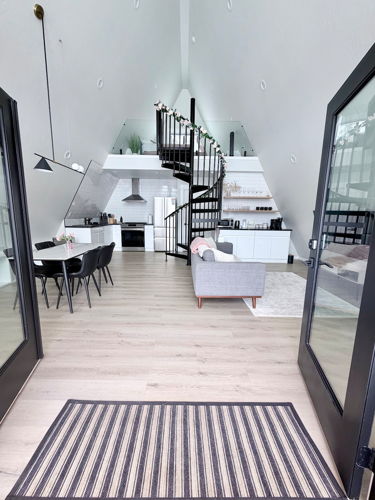 1 sypialnia na poddaszu z łóżkiem typu king, salon, mała kuchnia i łazienka z prysznicem o odpowiednim rozmiarze. Wnętrze z drewna świerkowego i deski. Zadaszony taras o powierzchni 262 stóp kwadratowych z prywatnym jacuzzi. Jest to wolnostojąca konstrukcja około 35 stóp od głównego domu. Data ukończenia to 20 maja, rozpoczęcie działalności 25.05.2022 do 15 października. Zdjęcia są bardzo aktualne, pokazują trawę i kamienie na w pełni ogrodzonym podwórku. Ta chata ma bardzo klasyczny, rustykalny urok. Wykonana jest z drewna świerku alaskańskiego. Tim i ja zbudowaliśmy to.