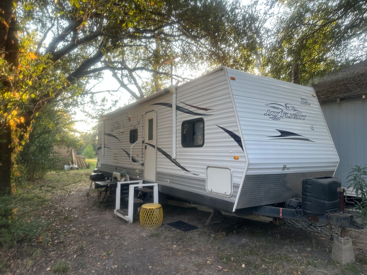 A place to yourself in East Texas, this comfy camper has the amenities to arrive and relax or use as a home base for adventures. Easy to get to, 1/4 mi. from Groveton businesses, 22 minutes from Trinity and nearby many East Texas towns and hunting and fishing areas. Master bedroom has full bed, TV. Main room has two pullout beds, TV. Kitchen has dishes, cookware, stovetop/oven, fridge/freezer. Bathroom has shower, toilet, two sinks, towels, basic toiletries. AC/heat. Patio area. Welcome!