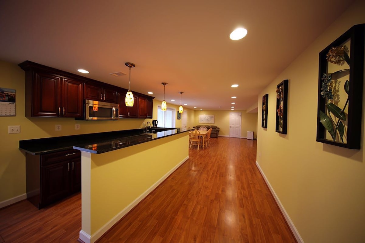Przestronny apartament z jedną sypialnią w piwnicy. Prywatne wejście, łazienka z toaletą i aneks kuchenny. Świeżo zaprojektowany taras z ogródkiem i stawem. Dźwięk bieżącej wody zapewnia relaksującą atmosferę. Odosobnione podwórko z tyłu do pięknego lasu. 5 minut drogi od szlaków rowerowych. Duża, otwarta przestrzeń mieszkalna z kanapą segmentową i jadalnią ze stołem, który może pełnić rolę stanowiska pracy. Centralne położenie w hrabstwie Montgomery - około 40 minut od DC/Baltimore/Frederick.