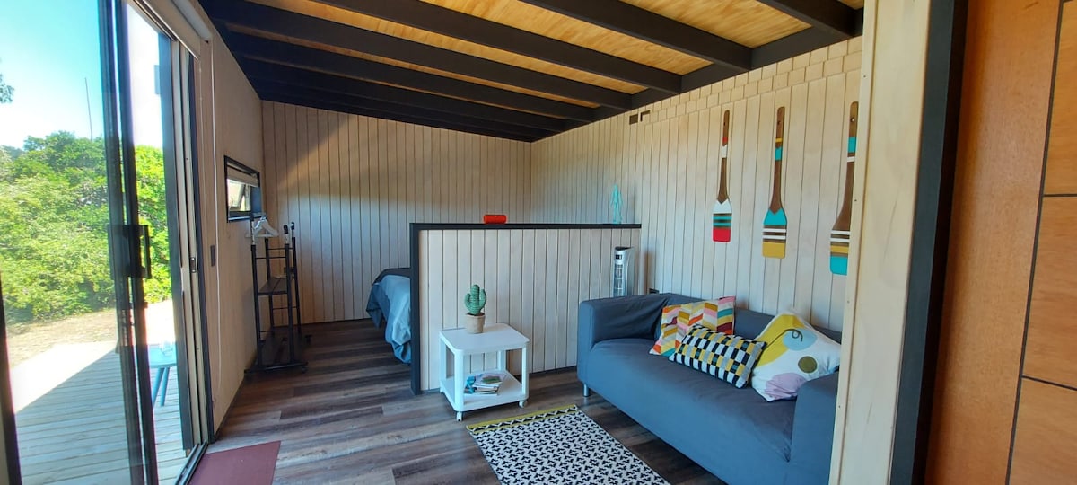 Przytulny azyl o powierzchni 24 m2, o unikalnym wystroju typu tiny house, położony w rodzimej dolinie ze spektakularnym widokiem na doliny, gdzie można zobaczyć wiele różnych ptaków. Idealne na ucieczkę od miasta i schronienie przed nadmorskim wiatrem. Duży taras z wanną z gorącą wodą na zewnątrz i zimnym prysznicem. Bardzo blisko do plaż Matanza i Pupuya. (1 łóżko typu queen + łóżeczko dla dzieci) . Zaleca się 4x4 na deszczowe dni - 4,5 km od Matanzas - 3,5 km od La Vega - 24 km od Puertecillo