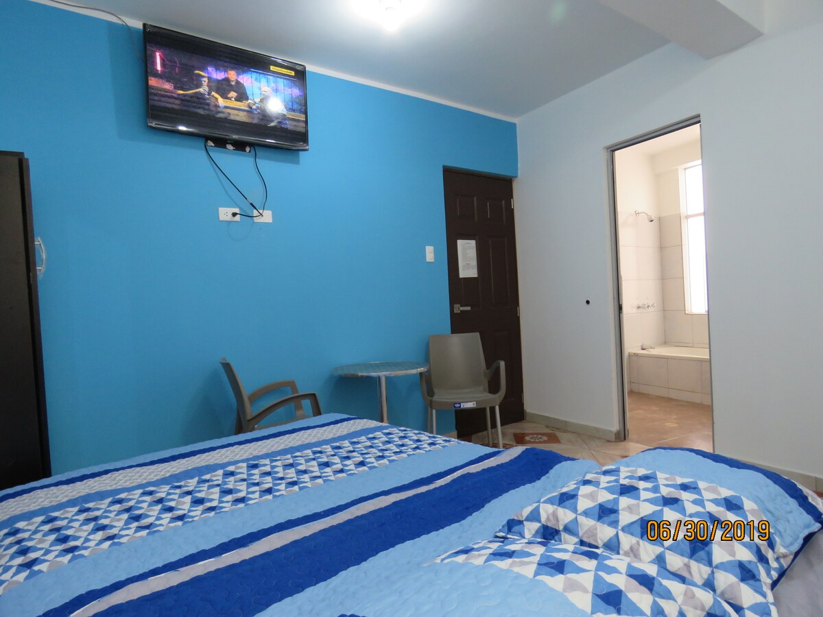 Rozkoszuj się komfortowym i jasnym pokojem dwuosobowym z prywatną łazienką i widokiem na ulicę. Hostal Bahía znajduje się w centrum Huánuco. To idealne miejsce na relaks lub zwiedzanie miasta. Mamy ciepłą wodę, Wi-Fi, Netflixa i przyjazną obsługę, aby Twój pobyt był przyjemny.