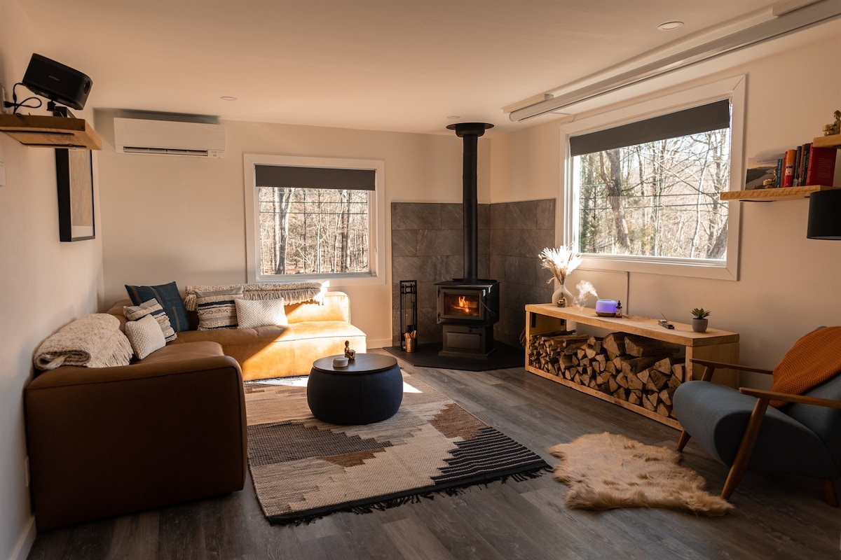 Otocz się przyrodą i przytulnym, nowoczesnym komfortem. Romantyczny domek w stylu mid-mod znajduje się na 10 akrach spokojnego lasu, a jednocześnie zaledwie 12 minut jazdy samochodem dzieli go od Mount Snow, gdzie można wspaniale pojeździć na nartach. 3 minuty do przystani na pięknym jeziorze Whitingham, gdzie można wypożyczyć skutery wodne i łodzie lub popływać i połowić ryby. Szlaki turystyczne do urokliwego miasta Wilmington z kawiarniami i restauracjami. Baseny i jacuzzi w górę drogi w klubie. Zaledwie kilka kroków od lodowiska, pickleballa, szlaków turystycznych i skuterów śnieżnych.