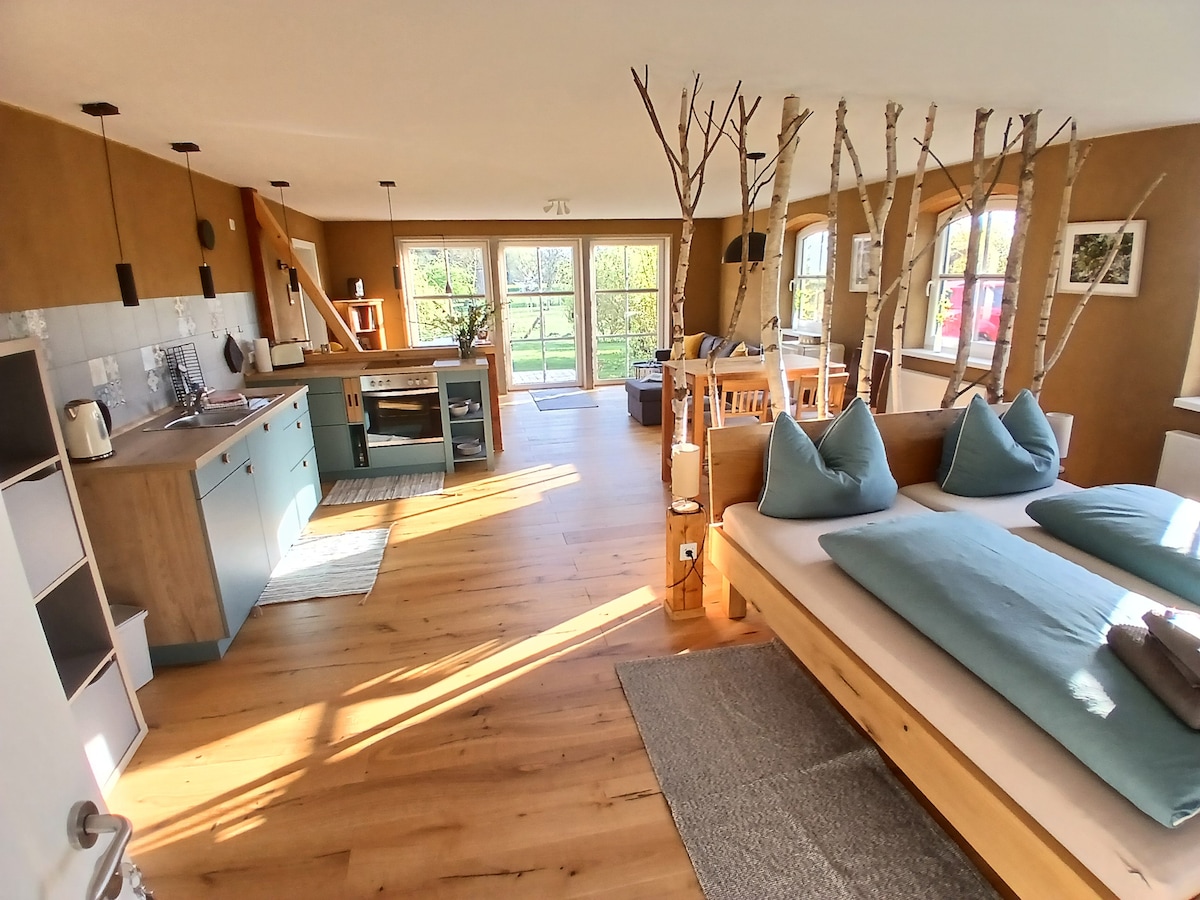 Zrelaksuj się z nami, pozostań w Gutspark i ciesz się chwilą. Apartament o powierzchni ok. 65 m2 znajduje się po wschodniej stronie na górnym piętrze zabytkowego dworu, który jest stopniowo przebudowywany. Goście mogą korzystać z tarasu. Wieczorem jest grill i kominek. Przez naszą łąkę owocową docieramy do Trebel, gdzie można łowić ryby, doświadczyć natury lub skorzystać z wiosła. Bassendorf to wiejska sielanka, do której można dotrzeć aleją o długości 2 km.